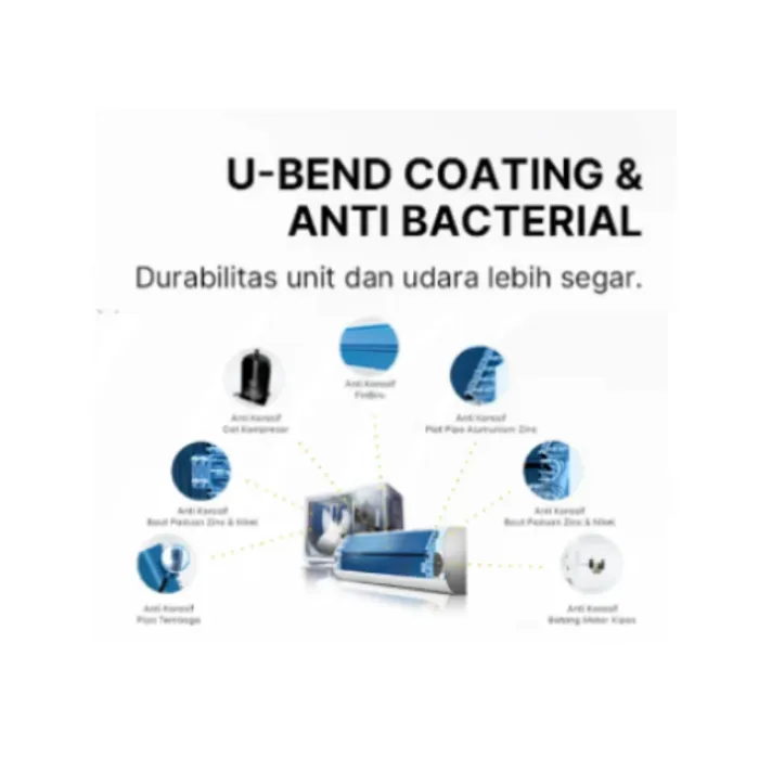 Anti Corrosion - Evaporator dan kondensor terbuat dari 100% tembaga dan dilapisi dengan blue fin, selain mampu meningkatkan efektifitas pendinginan juga mampu mencegah korosi dan karat.