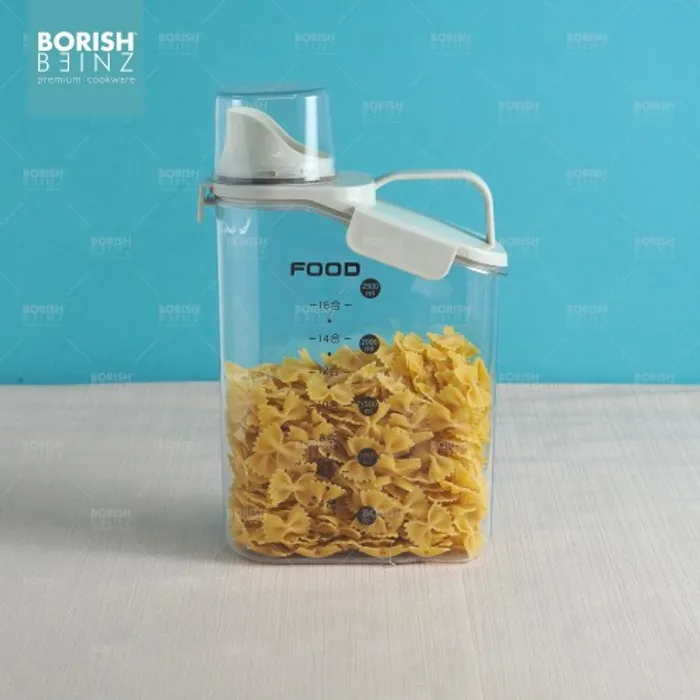 Toples penyimpanan dengan penutup takaran bening berbahan berkualitas dan kedap udara.