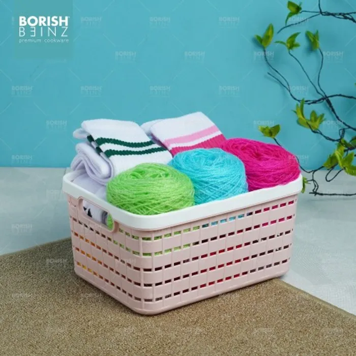 Keranjang serbaguna berbahan plastik tebal. Cocok untuk menyimpan aksesoris, kosmetik, snack, tempat souvenir.