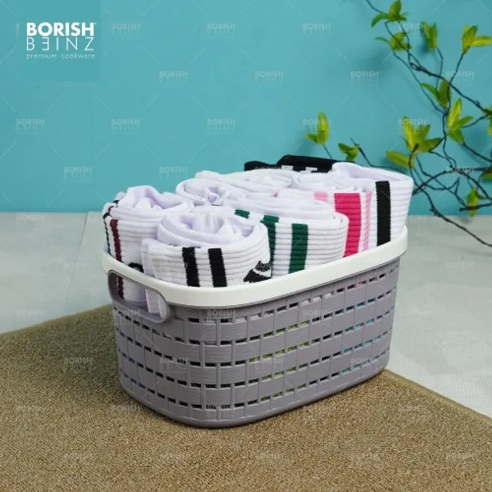 Keranjang serbaguna berbahan plastik tebal. Cocok untuk menyimpan aksesoris, kosmetik, snack, tempat souvenir.
