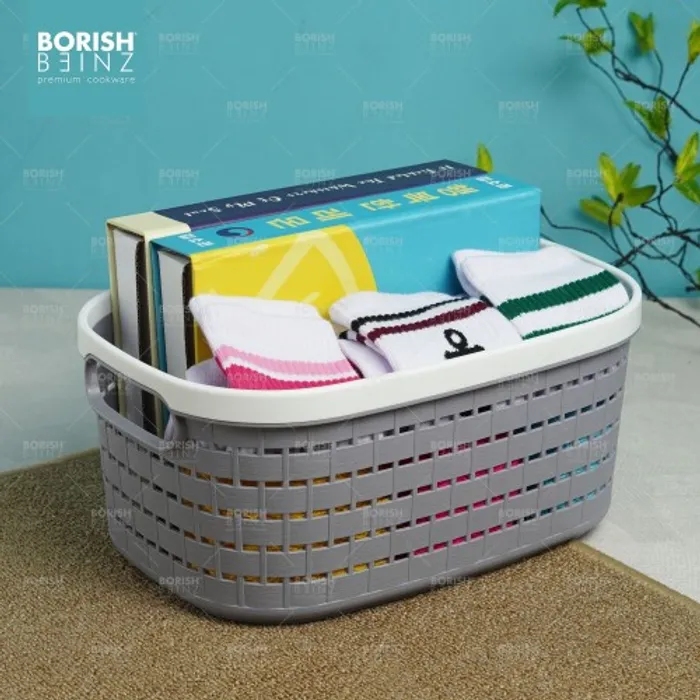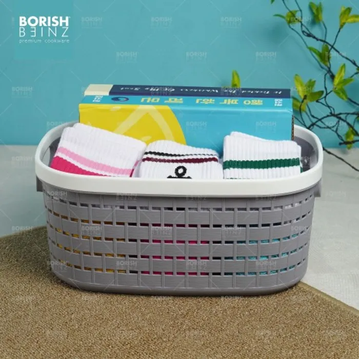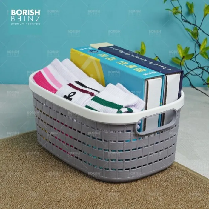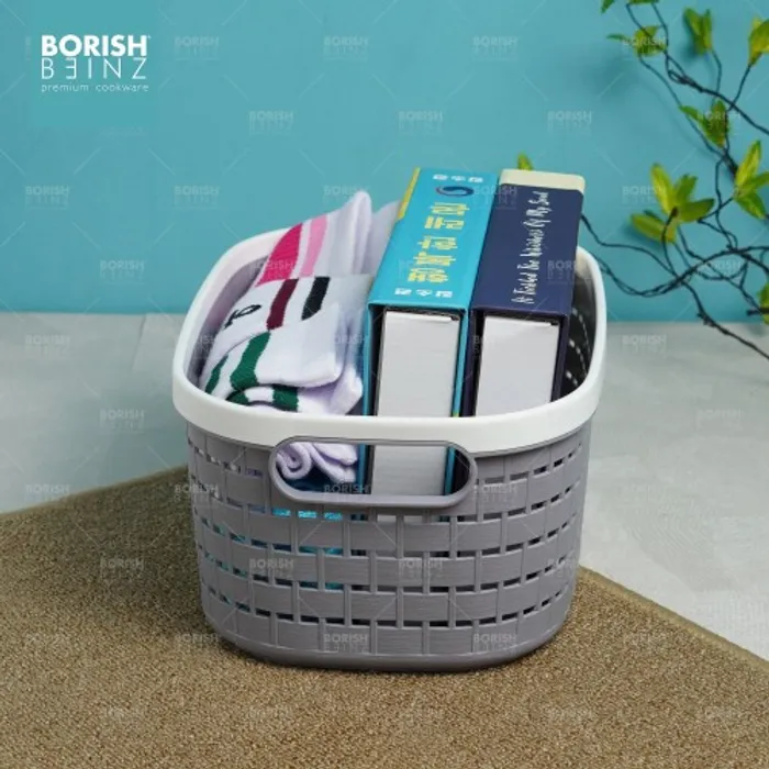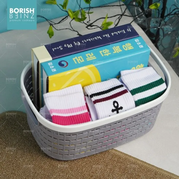 Keranjang serbaguna berbahan plastik tebal. Cocok untuk menyimpan aksesoris, kosmetik, snack, tempat souvenir.