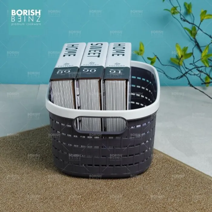 Keranjang serbaguna berbahan plastik tebal. Cocok untuk menyimpan aksesoris, kosmetik, snack, tempat souvenir.