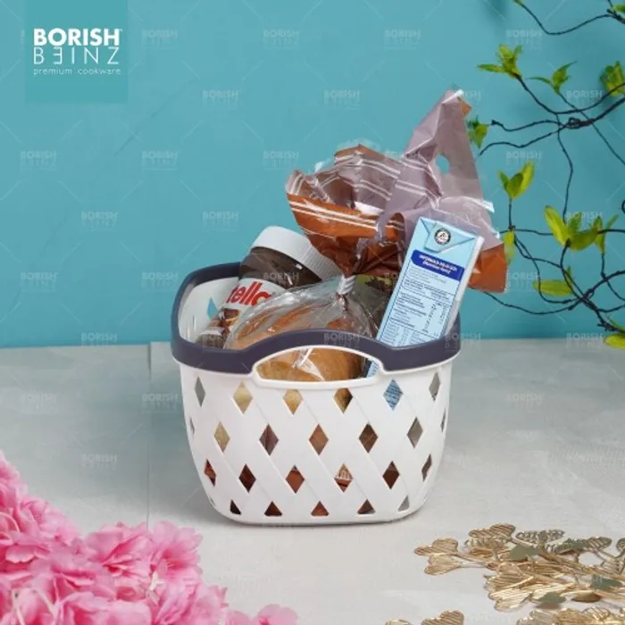 Keranjang serbaguna berbahan plastik tebal. Cocok untuk menyimpan aksesoris, kosmetik, snack, tempat souvenir.