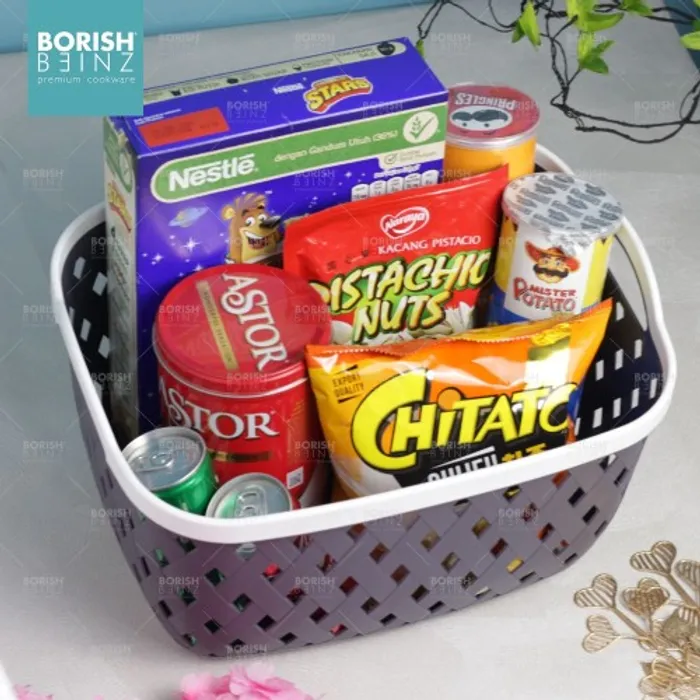 Keranjang serbaguna berbahan plastik tebal. Cocok untuk menyimpan aksesoris, kosmetik, snack, tempat souvenir.