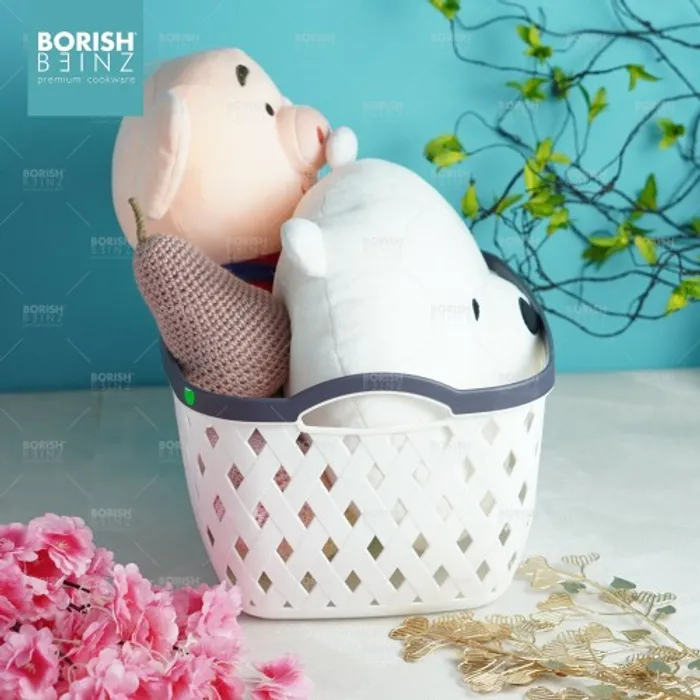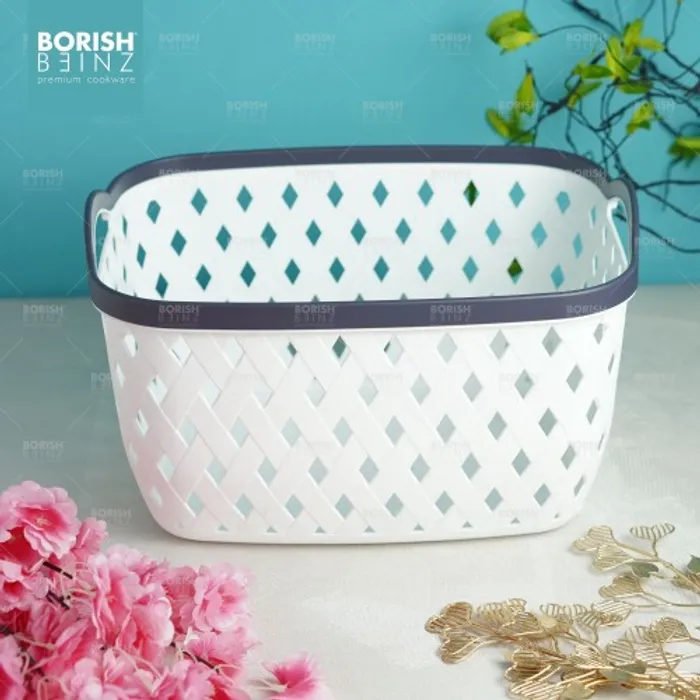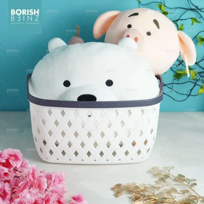 Keranjang serbaguna berbahan plastik tebal. Cocok untuk menyimpan aksesoris, kosmetik, snack, tempat souvenir.