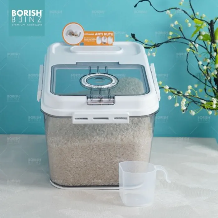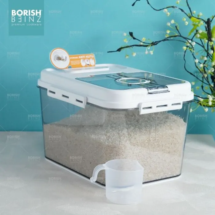 Dispenser beras otomatis anti lembab, dilengkapi cangkir untuk mengukur. Tempat beras dengan menggunakan material yang aman untuk beras yang disimpan awet dan tidak merusak kualitas beras yang disimpan.