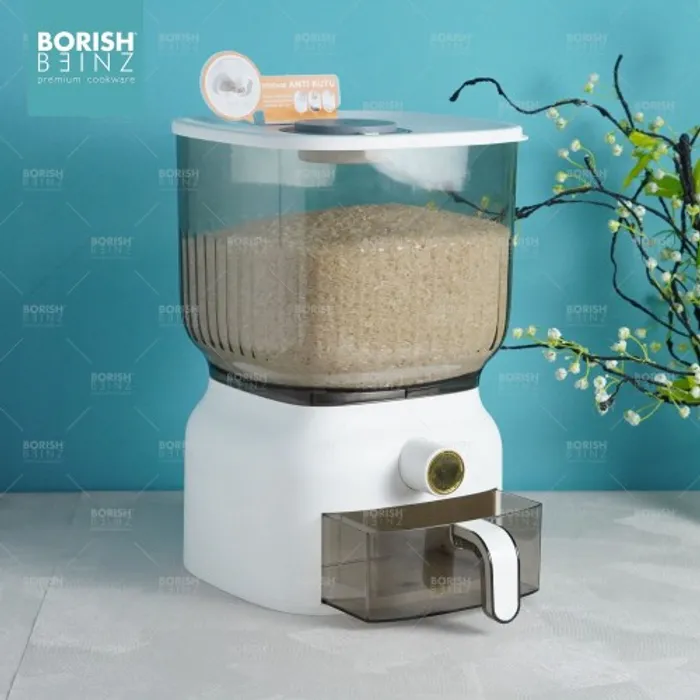 Dispenser beras otomatis anti lembab, dilengkapi cangkir untuk mengukur. Tempat beras dengan menggunakan material yang aman untuk beras yang disimpan awet dan tidak merusak kualitas beras yang disimpan.