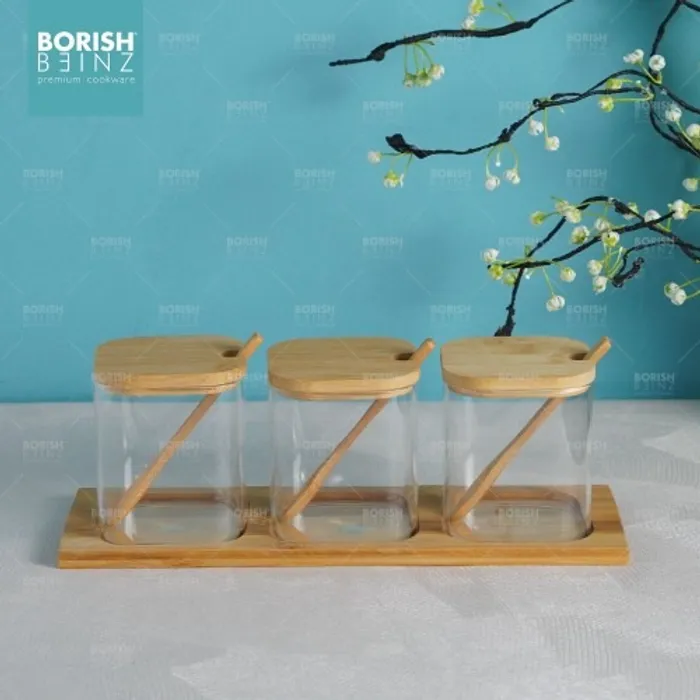 Satu set terdiri dari 3 tempat bumbu . Masing - masing tempat bumbu ada tutup nya dan dilengkapi sendok bumbu.