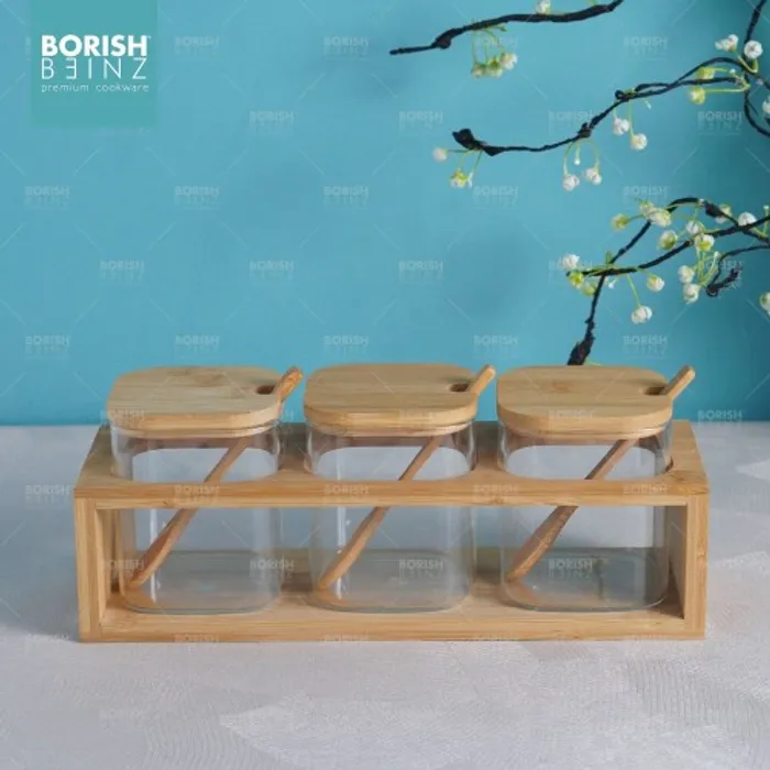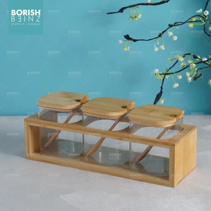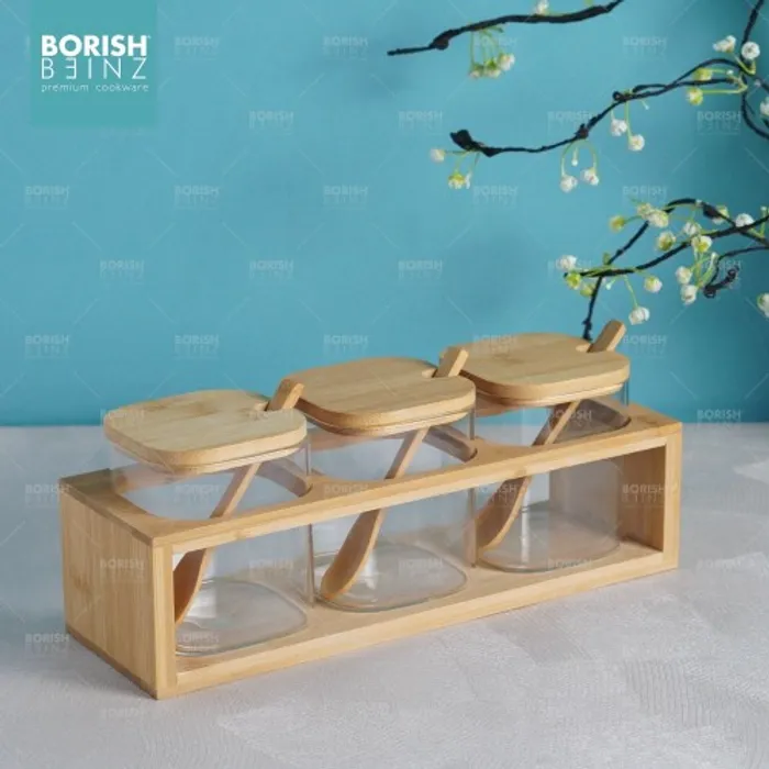 Satu set terdiri dari 3 tempat bumbu . Masing - masing tempat bumbu ada tutup nya dan dilengkapi sendok bumbu.