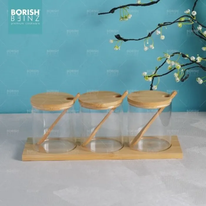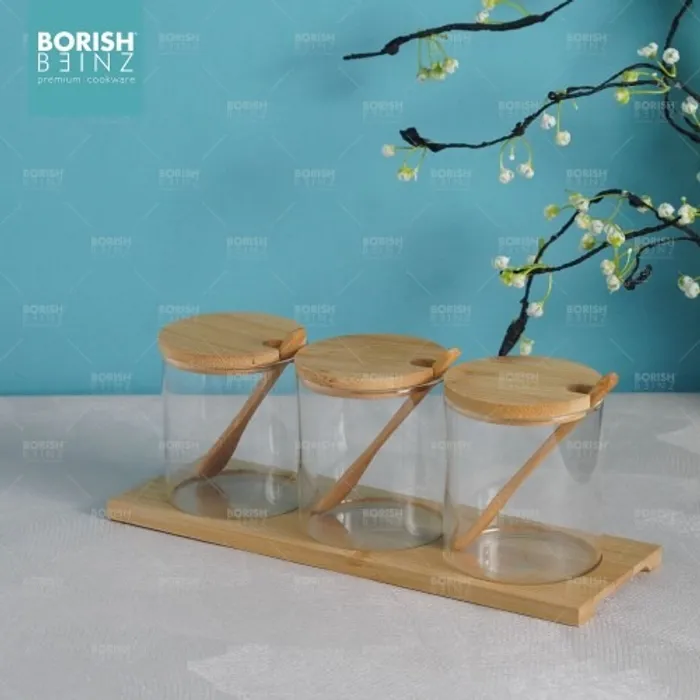 Satu set terdiri dari 3 tempat bumbu . Masing - masing tempat bumbu ada tutup nya dan dilengkapi sendok bumbu.