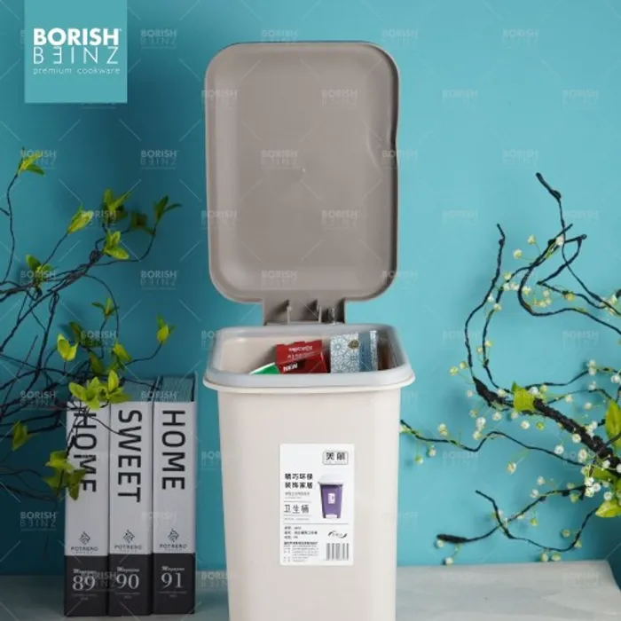 Tempat sampah kotak model injak dengan fitur penutup soft closing .