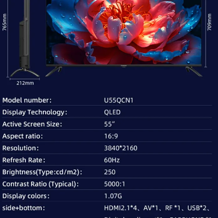 - "Side + Bottom: HDMI2.1*4AV*1RF *1USB*2Digital audio out*1EARPHONE *1"