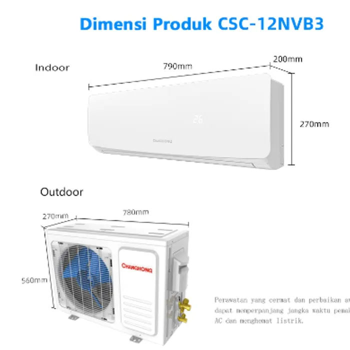 - Ukuran unit Indoor Ac : 790 x 200 x 270 mm