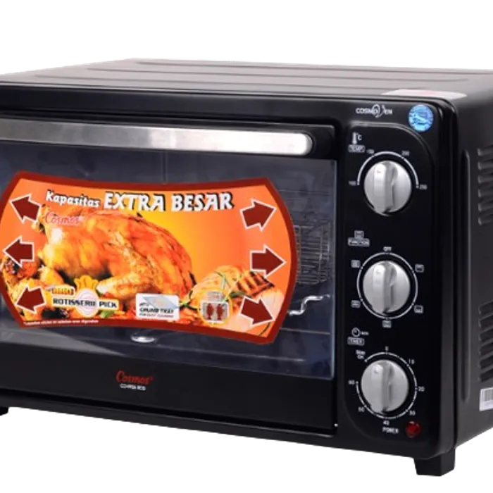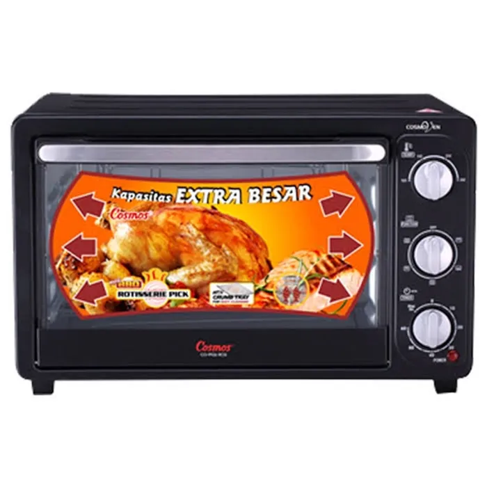Oven Cosmos berkapasitas besar 26 liter untuk memanggang berbagai macam masakan seperti kue kering, ayam panggang, dll. Dilengkapi BBQ Rotisserie Pick (Pemanggang berputar otomatis) dan Fish Grill (Pemanggang Ikan).