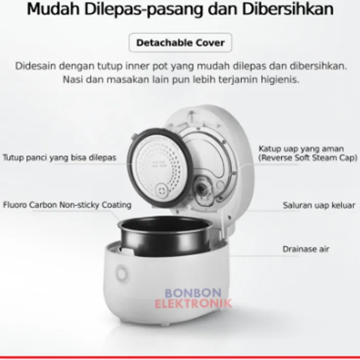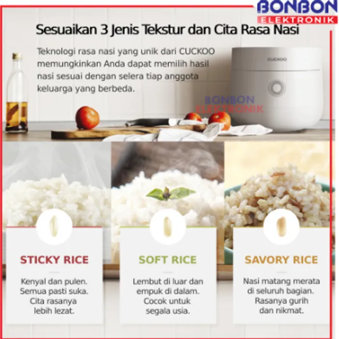 Satu lagi Digital Rice Cooker dengan fitur inovatif untuk menghasilkan 3 jenis tekstur dan cita rasa nasi berbeda. Fitur ini memungkinkan Anda memasak nasi yang pulen, nasi yang lembut atau nasi yang gurih. Sehingga Anda bisa menyiapkan nasi sesuai selera tiap anggota keluarga. Tidak sampai di sana, produk serbaguna ini juga bisa diandalkan untuk memasak aneka masakan, sayuran, daging maupun resep olahan berbahan telur.