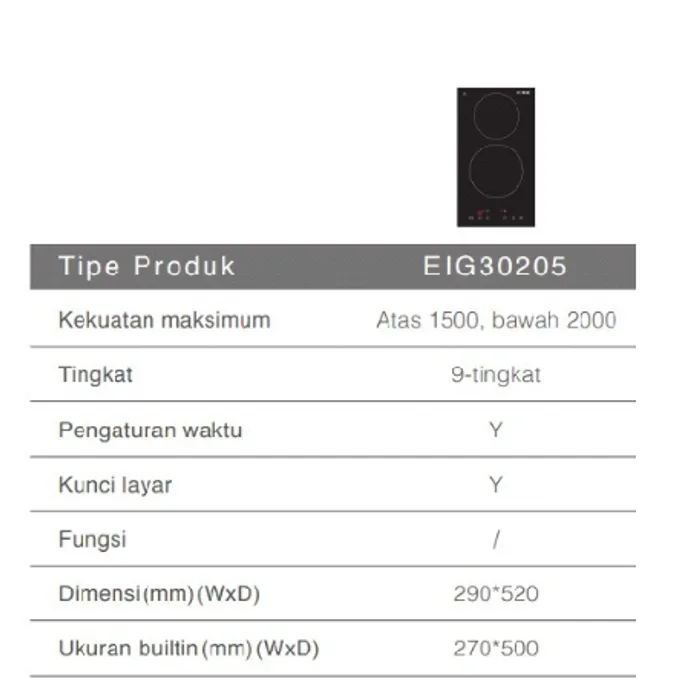 Fotile Induction Hob EIG30205 merupakan seri terbaru untuk kompor induksi Fotile, dengan design yang mewah dan premium. Dilengkapi dengan 9 Level Heat Power, Heat Indicator System, Ceramic-glass panel, Automatic Shut-off System, Child Lock Function, dan Touch Control.