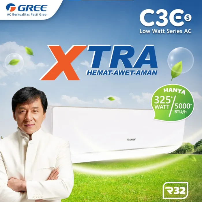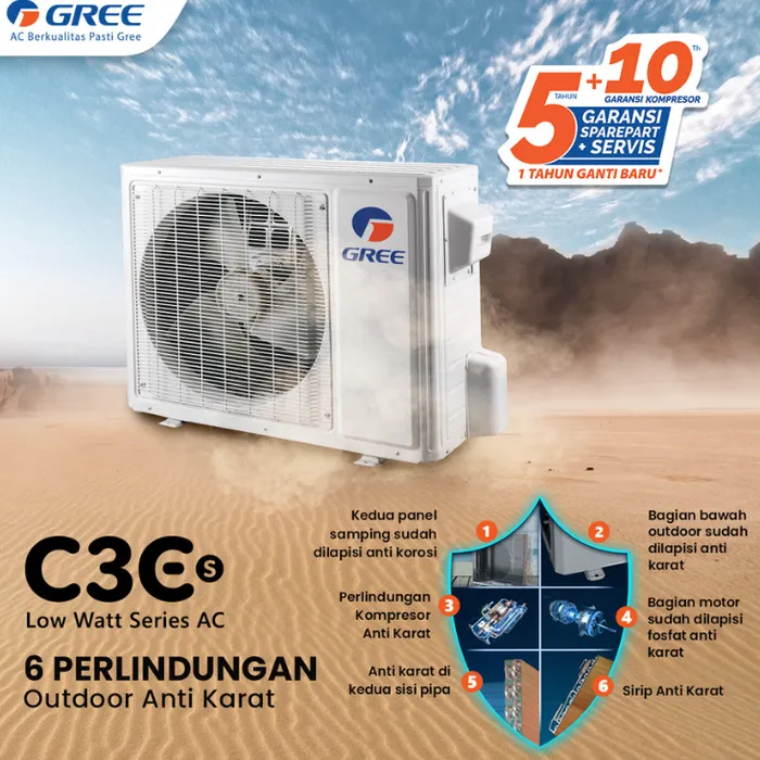 AC Gree C3E(S) Deluxe Low Watt miliki keunggulan 4 EKSTRA; yaitu Ekstra Hemat, Ekstra Awet (Menggunakan perlindungan anti karat), Perlindungan Ekstra, Ekstra Aman. Di tambah teknologi “Pengingat Pintar”, yaitu kemampuan mengingat seluruh pengaturan pada remote mulai dari suhu, kecepatan kipas, jam, dan mode lainnya, ketika menyala kembali setelah listrik padam. AC hemat energi terbaru yang menggunakan Freon R32 ramah lingkungan dan 4 Protection yaitu; Anti Api, Anti Bocor, Anti tegangan tinggi, Anti korsleting dan AC Series ini sudah dilengkapi dengan Filter DIY dimana kita bebas memilih fungsi filter sesuai dengan kebutuhan pengguna. Filter yang tersedia ( Filter Pembersih Tungau, Filter Antiseptik, Filter Penghilang Bau dengan Nano Fotokatalis, Filter Antibakteri Penghilang Formalin, Filter Alami Antibakteri, Filter Vitamin C Anti Biosida). Outdoor AC GREE telah mendapatkan sertifikasi RoHS, QC Pass, dan CCC.