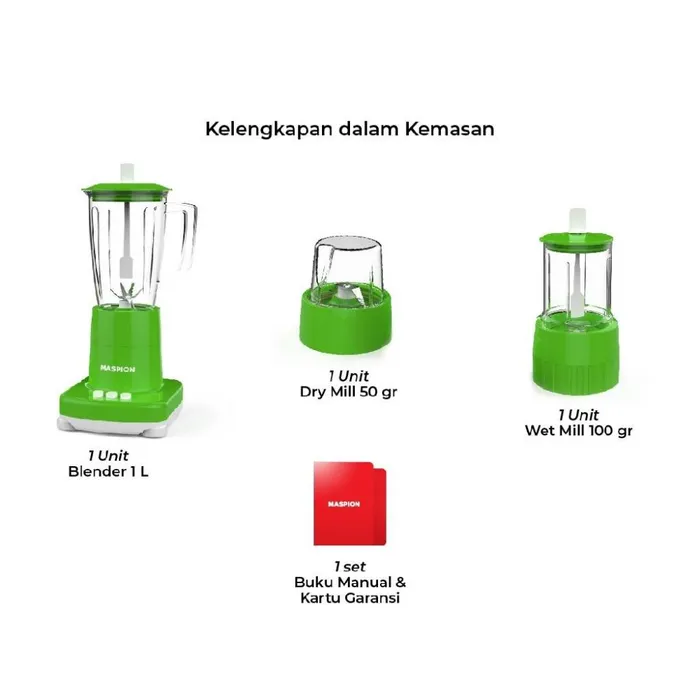 | Kapasitas | 1 L (Blender), 50gr (Dry Mill), 100gr (Wet Mill) |