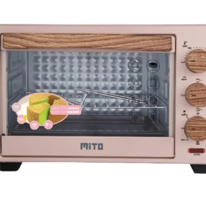 Oven Listrik Mito MO777 hadir dengan design terbaru knob dan handle kayu yang elegan dan estetik.