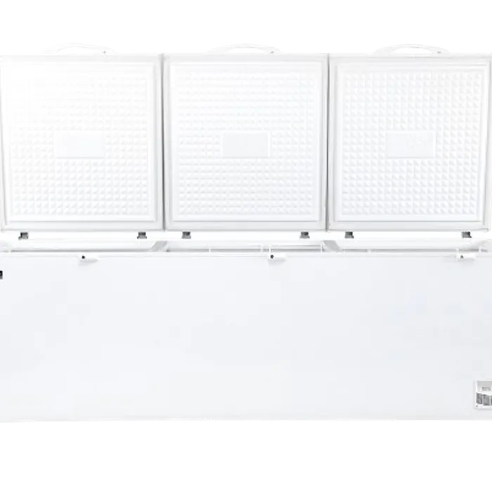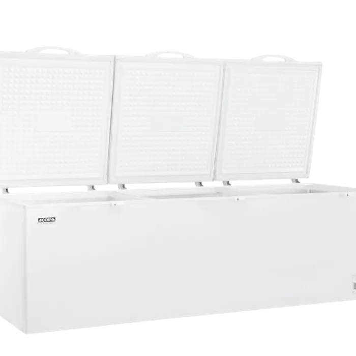 Chest freezer heavy duty dengan Power Duo Cooling, lapisan aluminium, lubang pembuangan udara, pintu yang dapat dikunci, dan keranjang yang kuat.