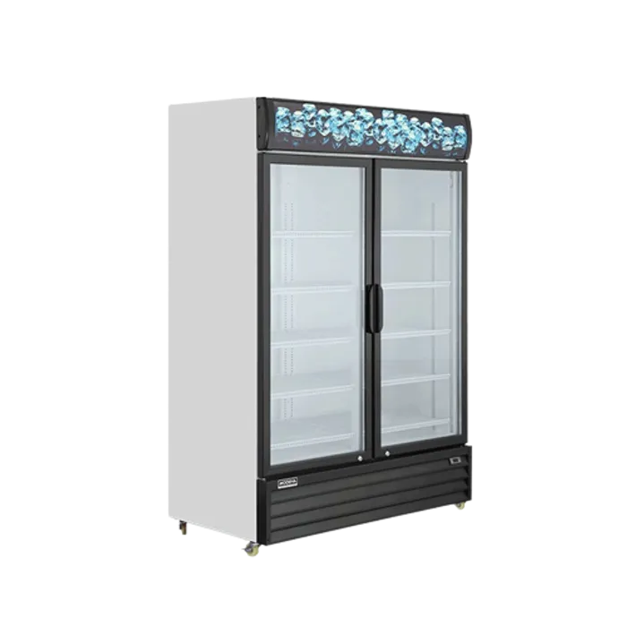 Showcase cooler dengan kaca dua lapis, penguapan otomatis, udara anti embun, dan kompresor heavy duty.