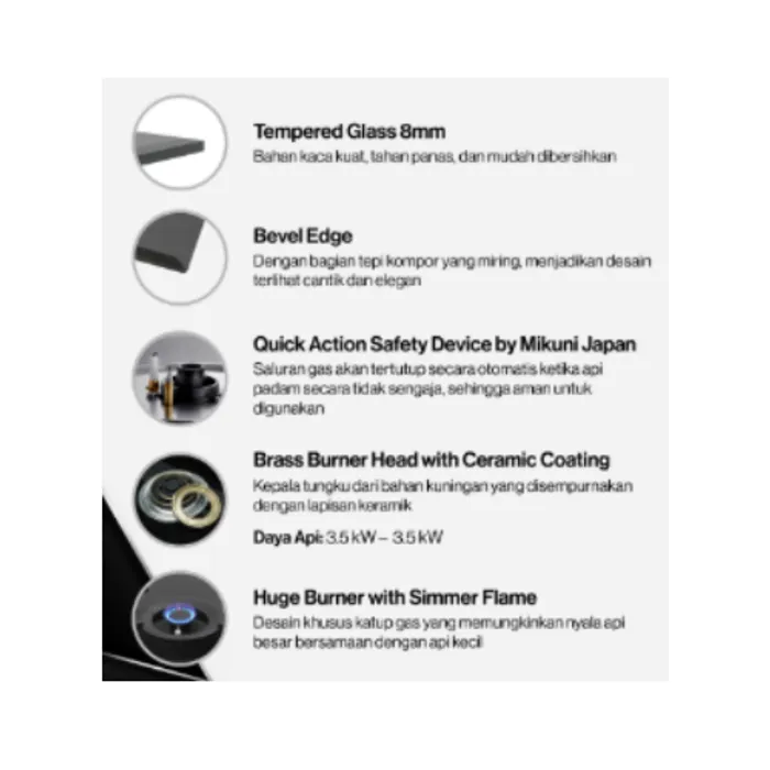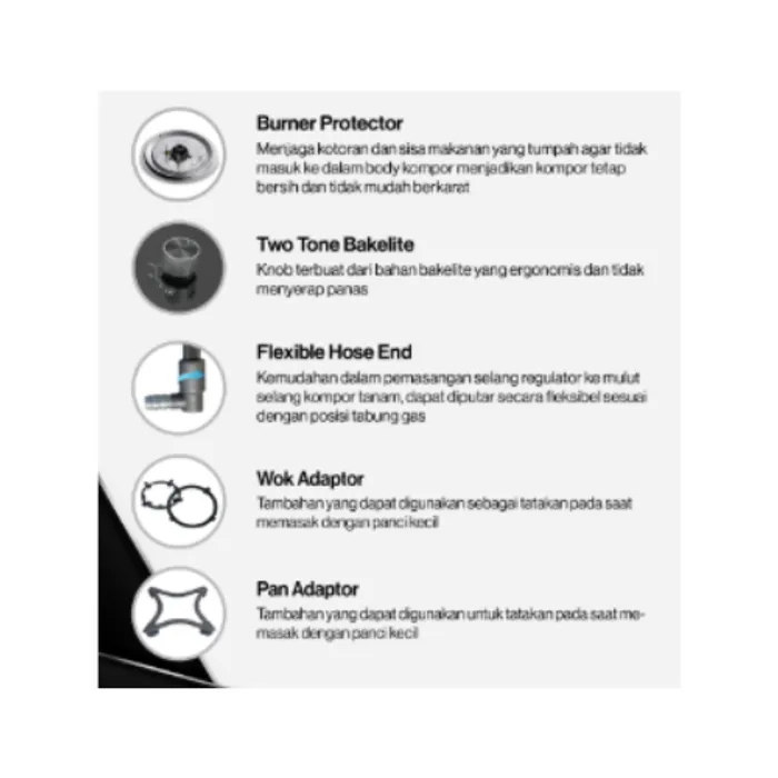 Safety Device: Fitur keselamatan canggih dari Mikuni Japan yang otomatis memutus aliran gas jika api padam, mencegah kebocoran gas yang berbahaya.