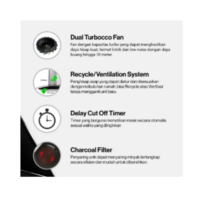 Delay Cut Off Timer: Fitur pengatur waktu yang memungkinkan perangkat tetap menyala selama beberapa saat setelah memasak selesai, untuk memastikan semua sisa asap dan bau terhisap sempurna.