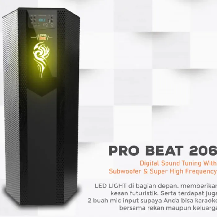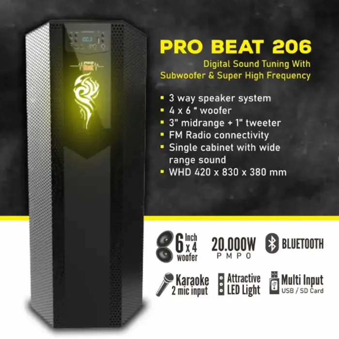 Speaker Aktif Roadmaster PRO Beat 206 dengan 4 Woofer 6" ini memiliki suara yang sangat bagus dan dashyat, menghasilkan suara musik dengan power yang sangat kuat sekali, juga dilengkapi dengan Light Colourful LED.