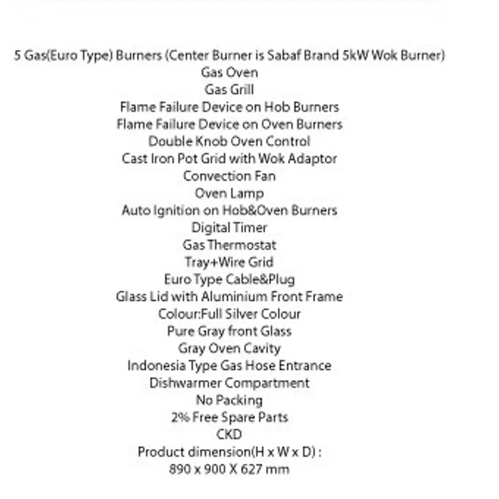 5 Gas(Euro Type) Burners (Center Burner is Sabaf Brand 5kW Wok Burner)