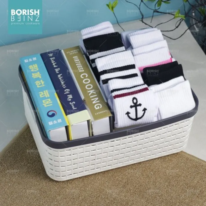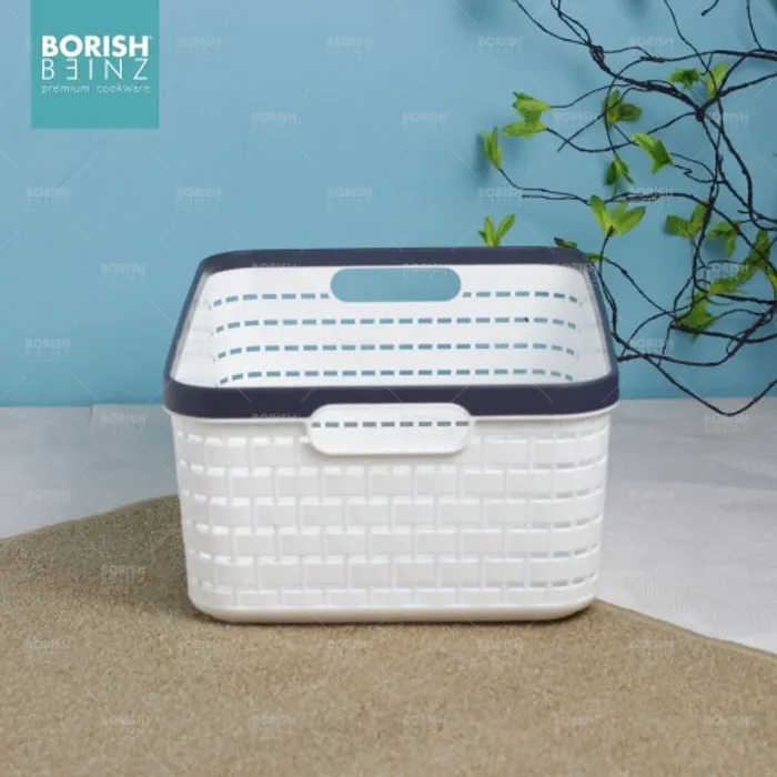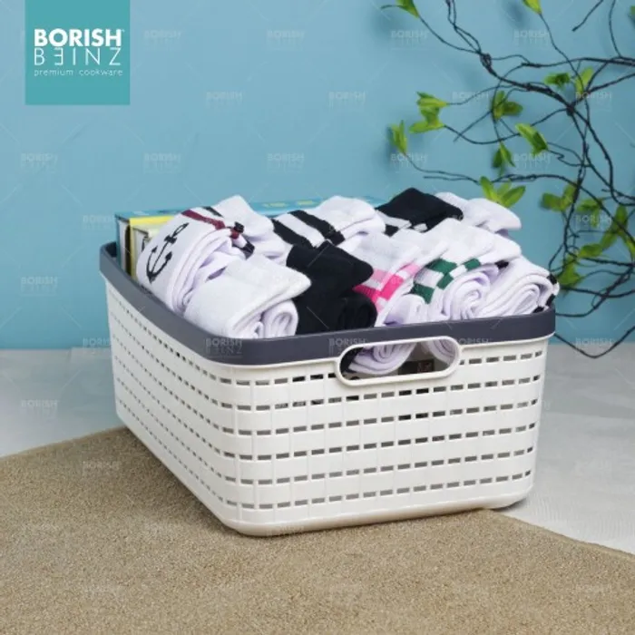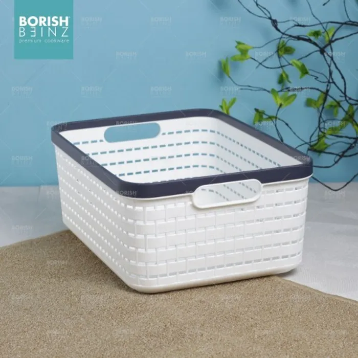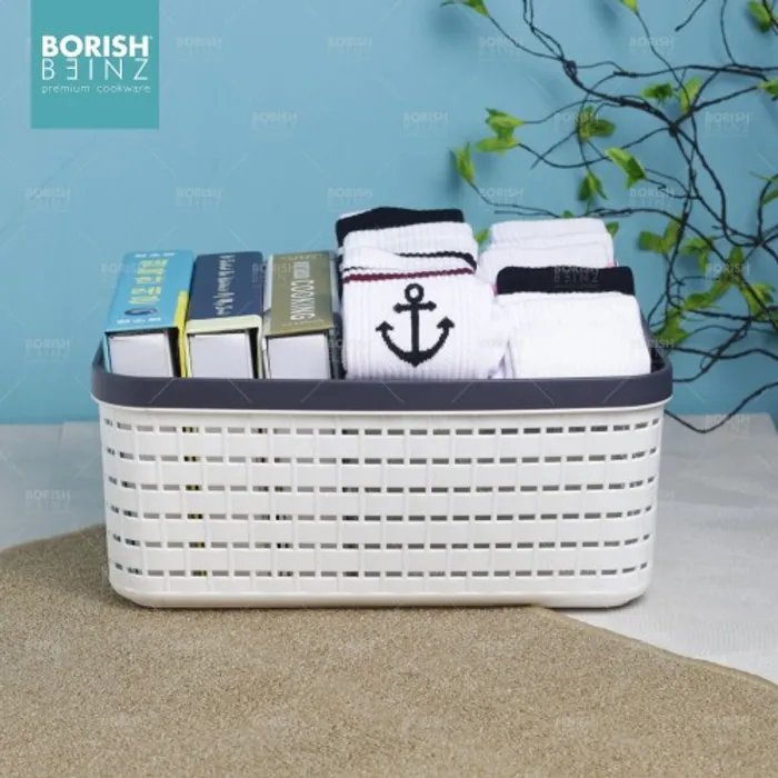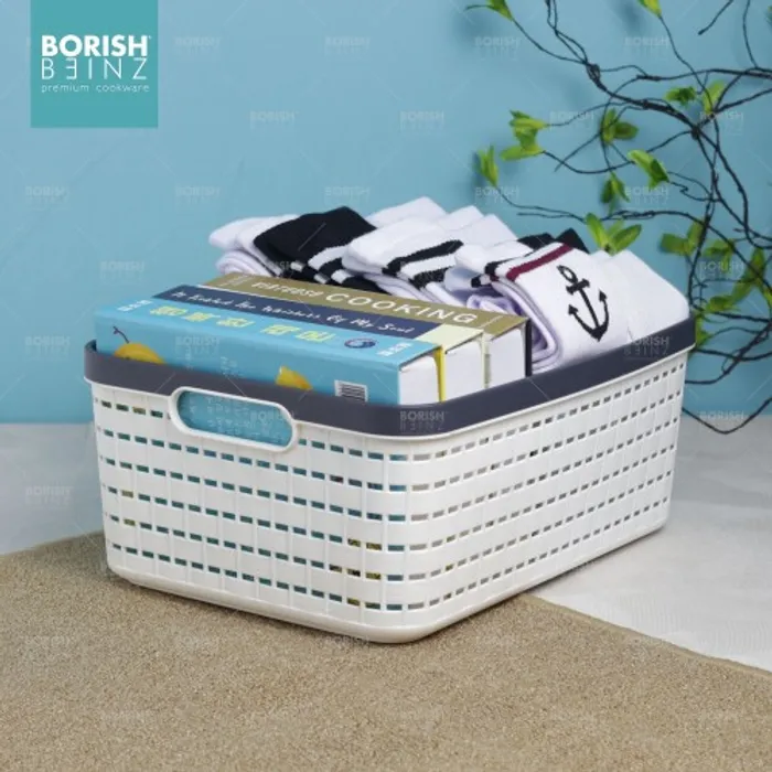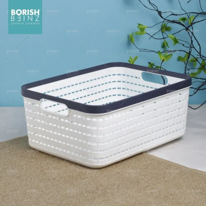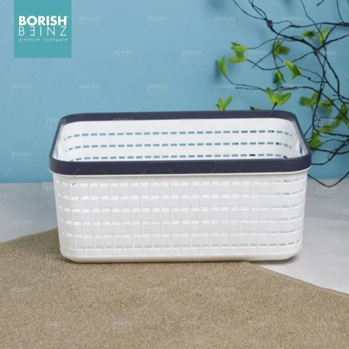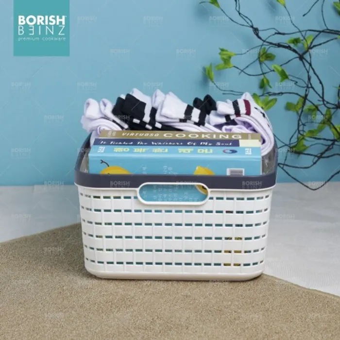 Keranjang serbaguna berbahan plastik tebal. Cocok untuk menyimpan aksesoris, kosmetik, snack, tempat souvenir.