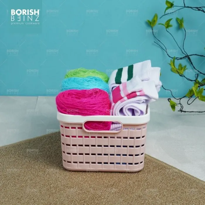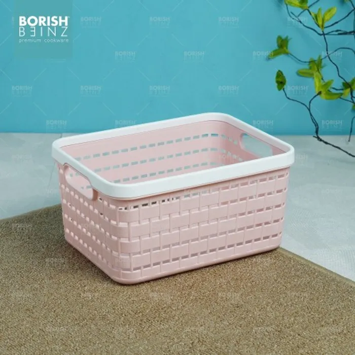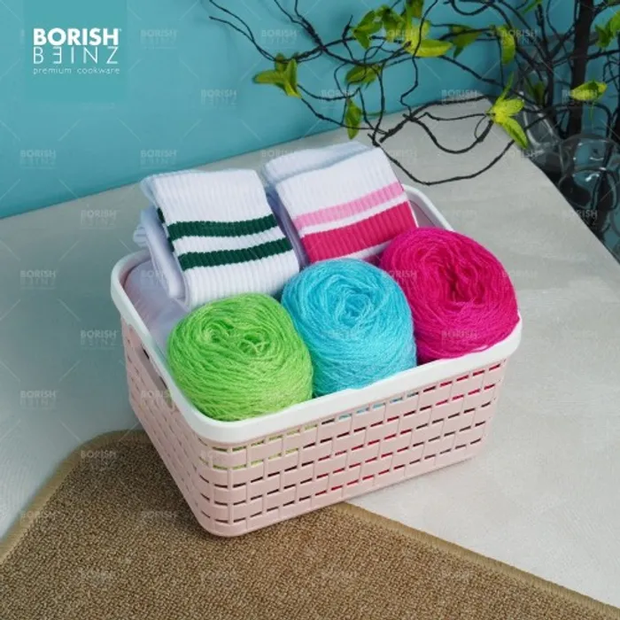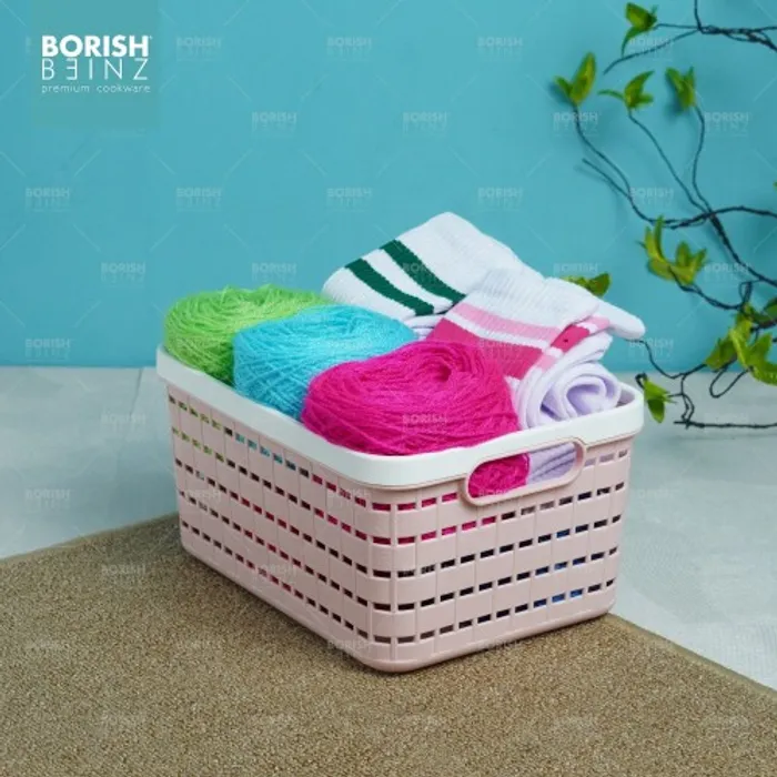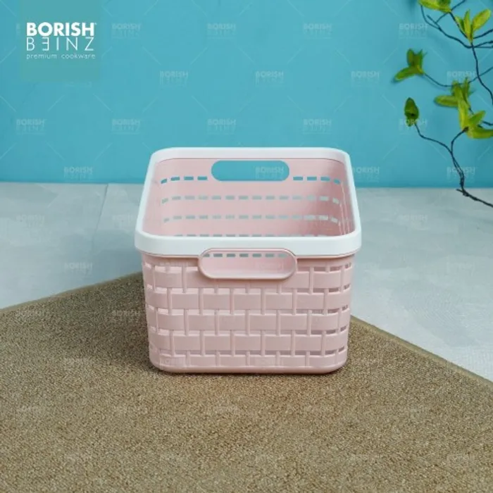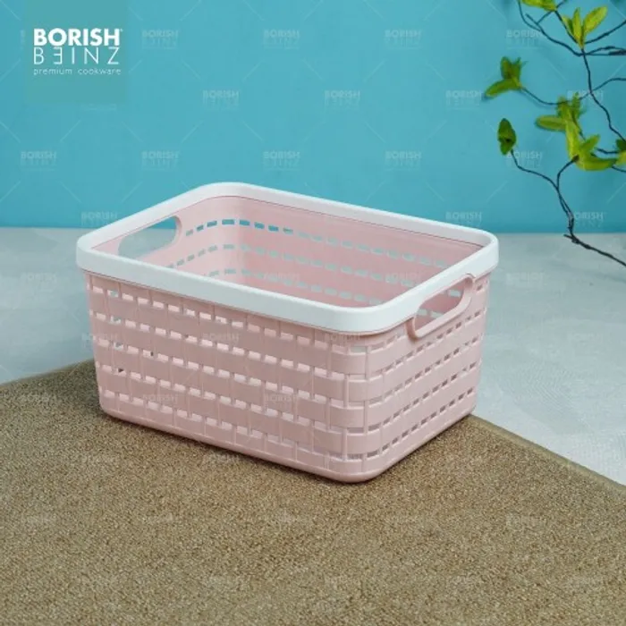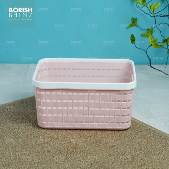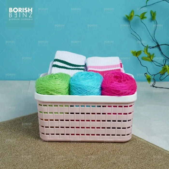 Keranjang serbaguna berbahan plastik tebal. Cocok untuk menyimpan aksesoris, kosmetik, snack, tempat souvenir.