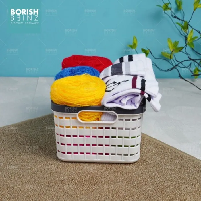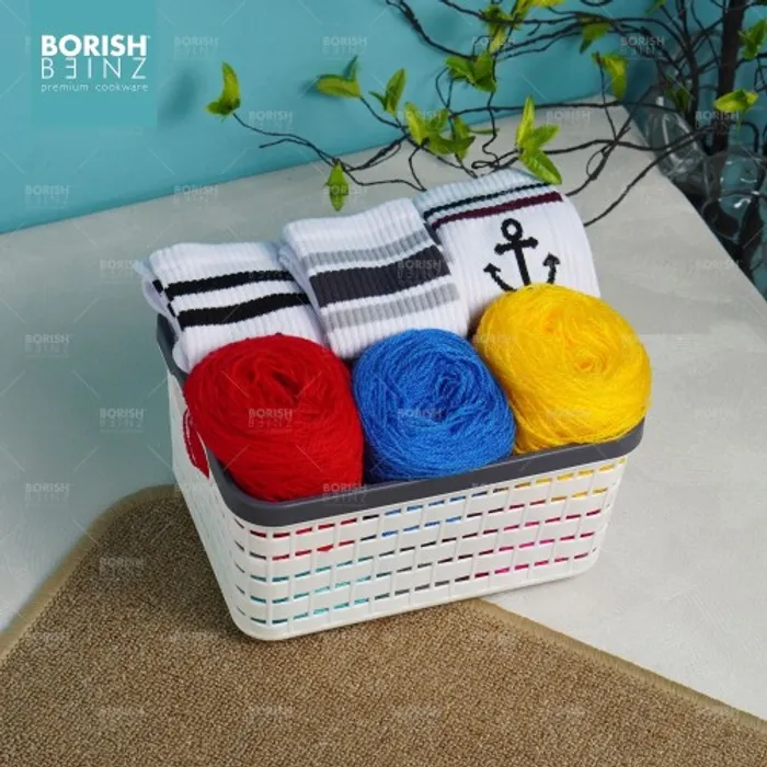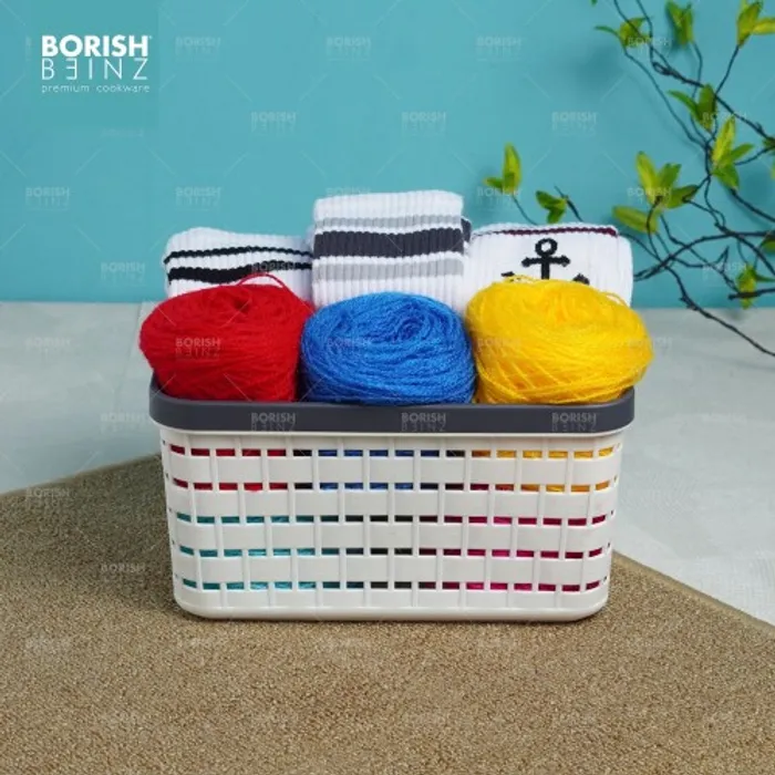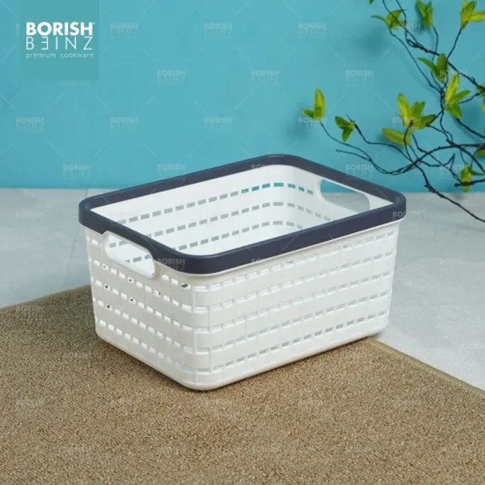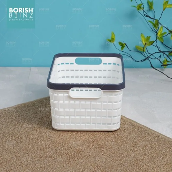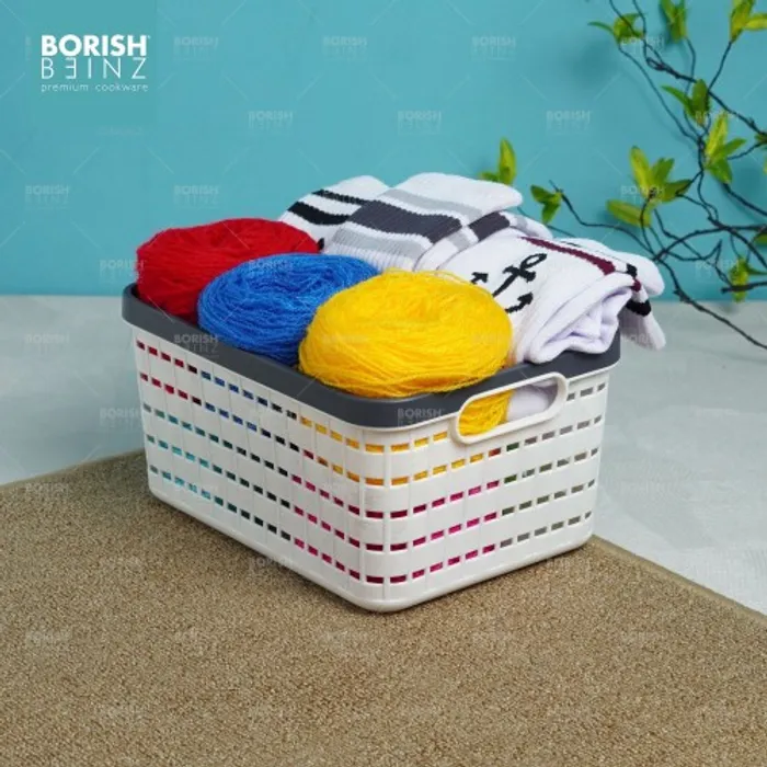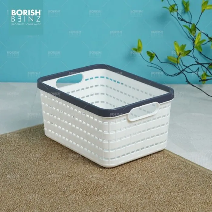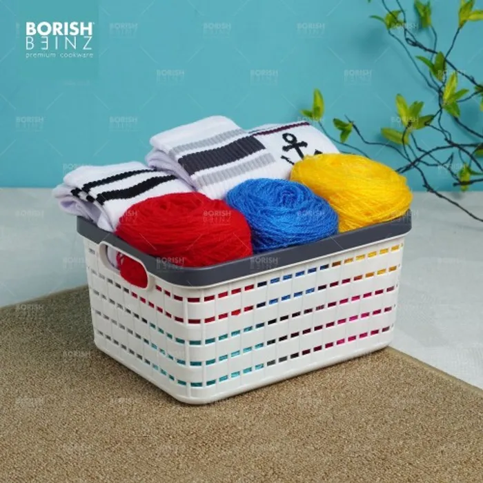 Keranjang serbaguna berbahan plastik tebal. Cocok untuk menyimpan aksesoris, kosmetik, snack, tempat souvenir.