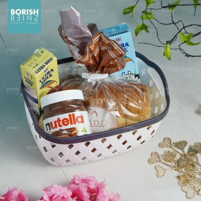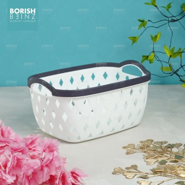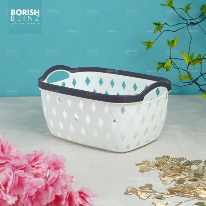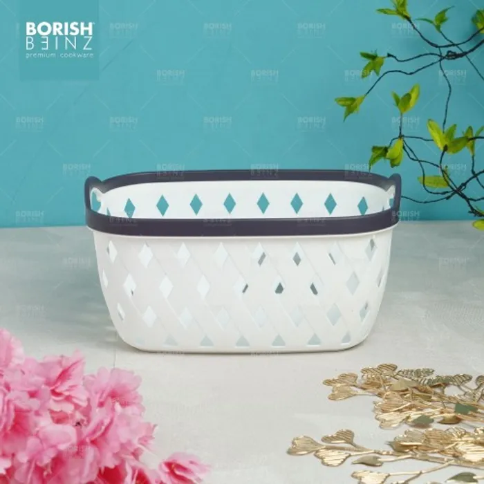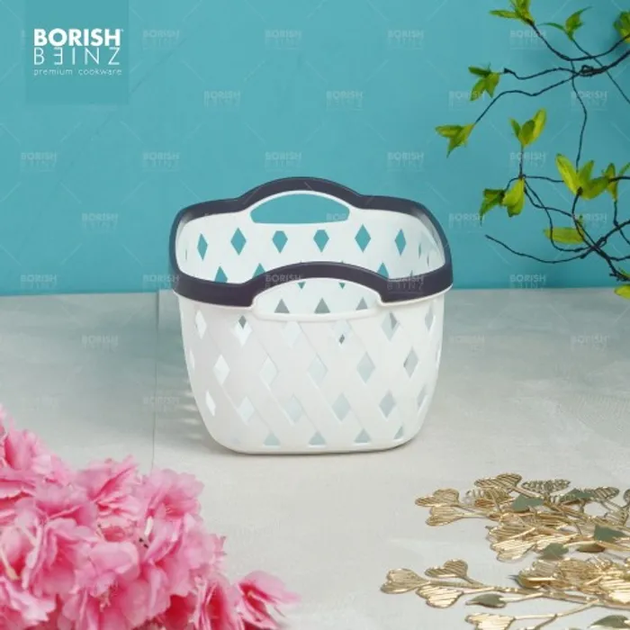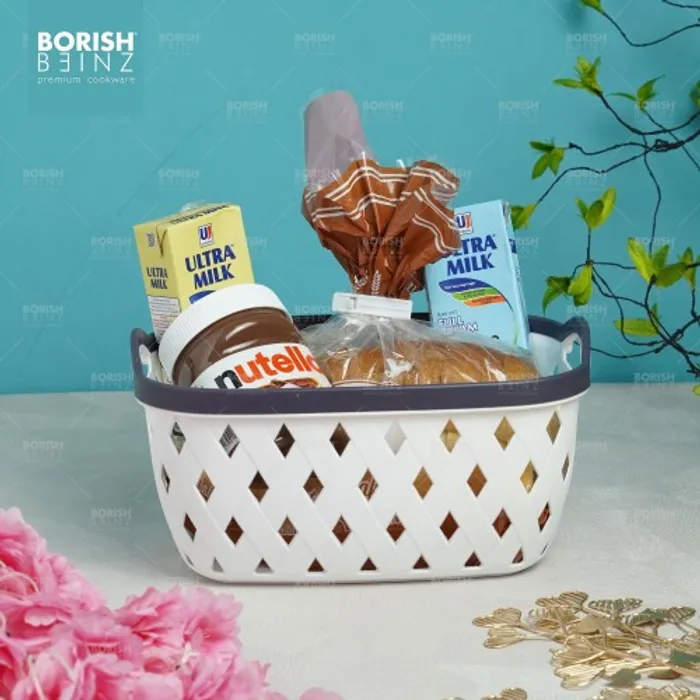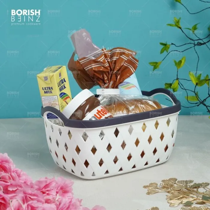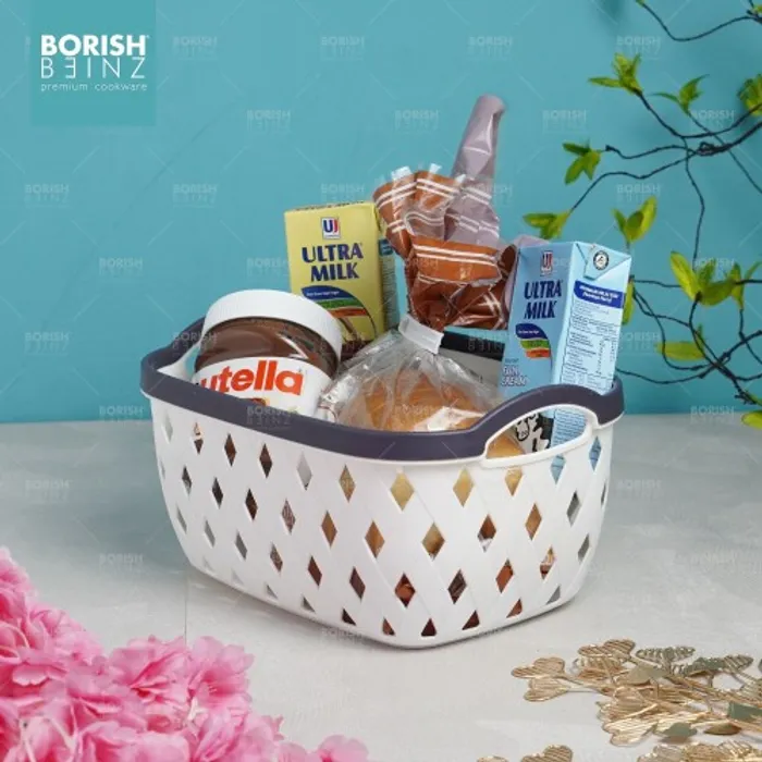Keranjang serbaguna berbahan plastik tebal. Cocok untuk menyimpan aksesoris, kosmetik, snack, tempat souvenir.