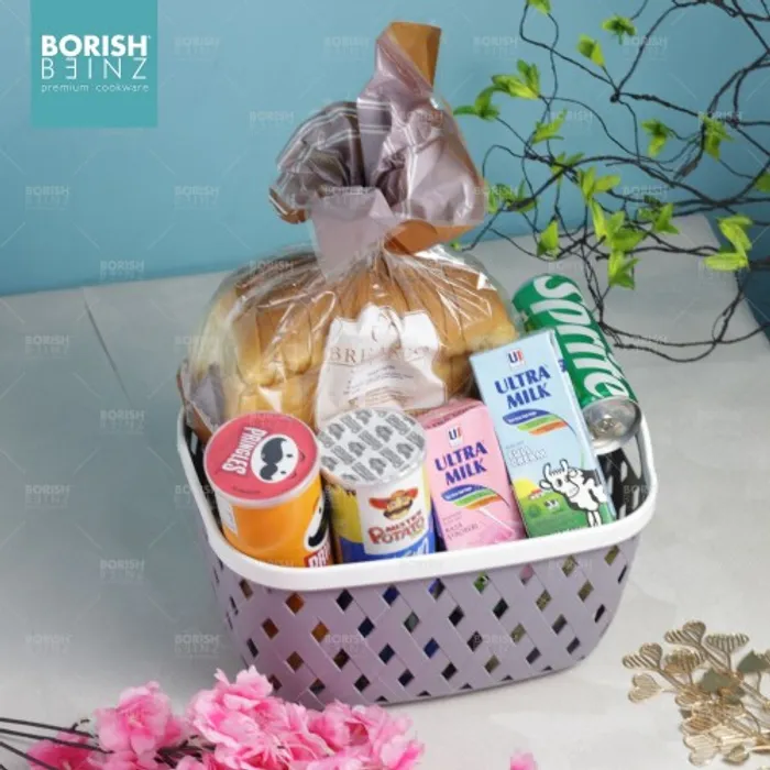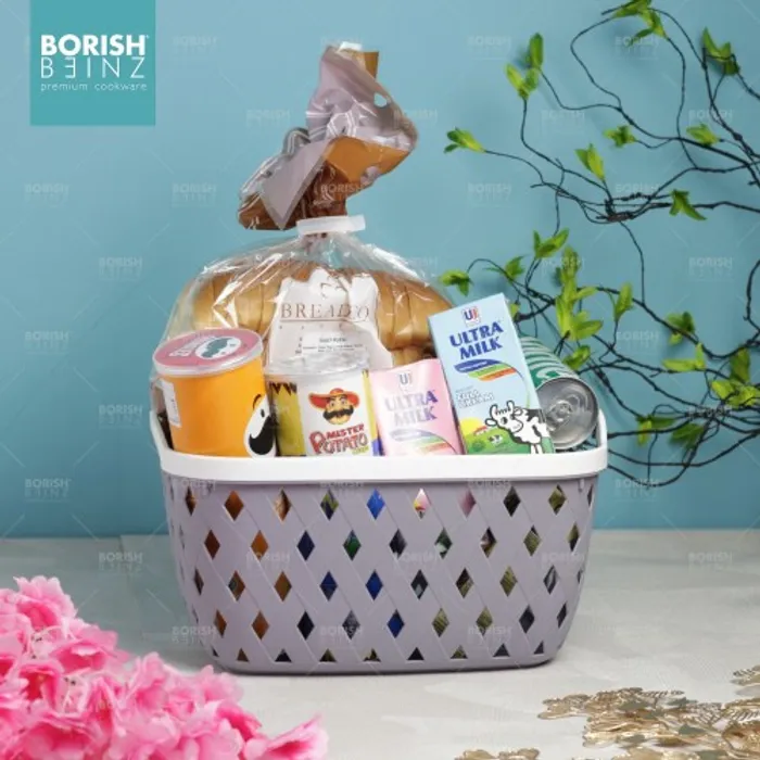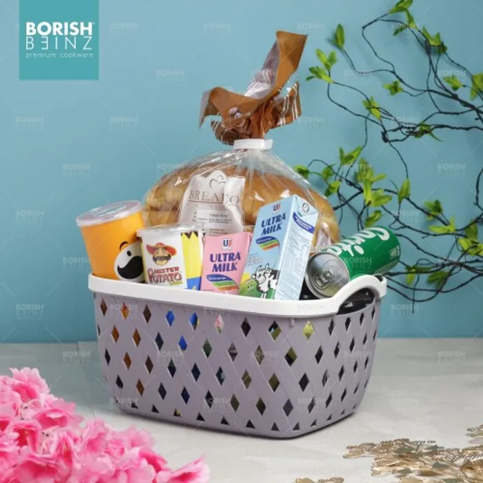Keranjang serbaguna berbahan plastik tebal. Cocok untuk menyimpan aksesoris, kosmetik, snack, tempat souvenir.