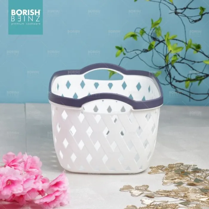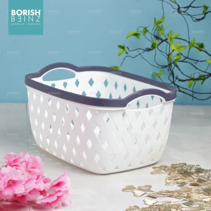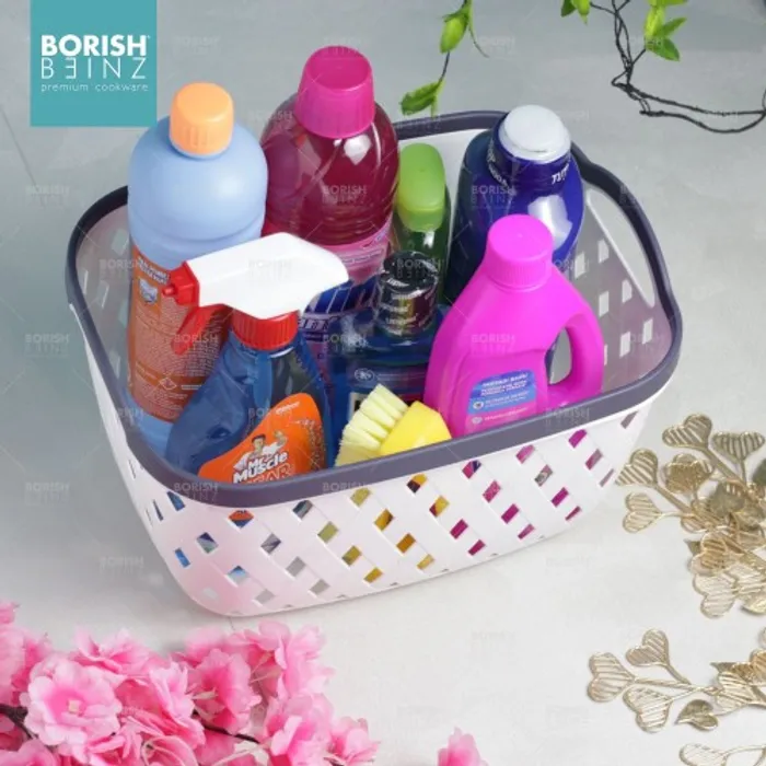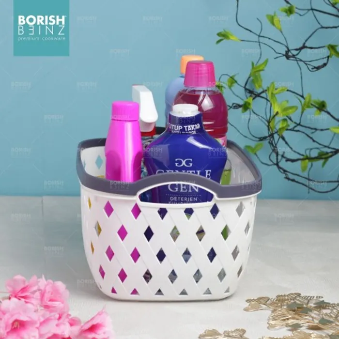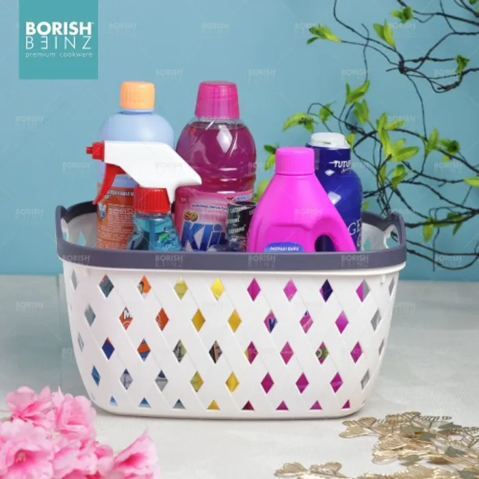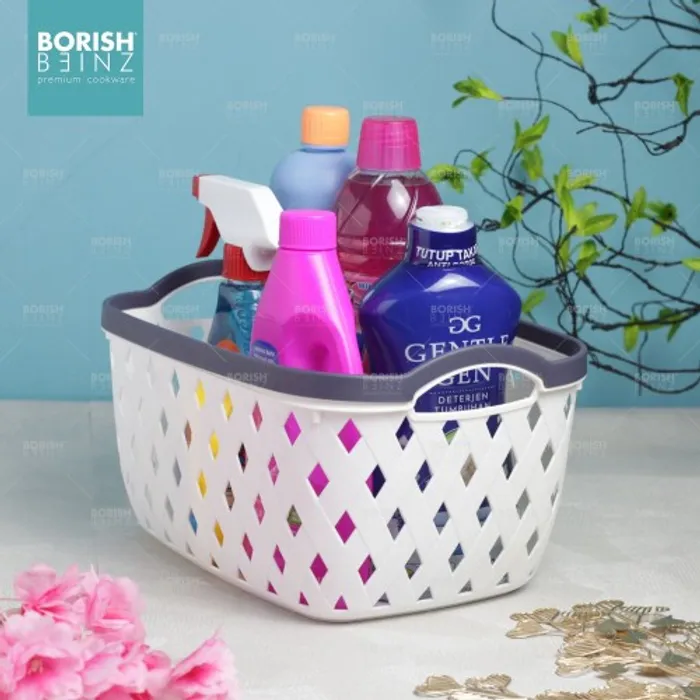 Keranjang serbaguna berbahan plastik tebal. Cocok untuk menyimpan aksesoris, kosmetik, snack, tempat souvenir.