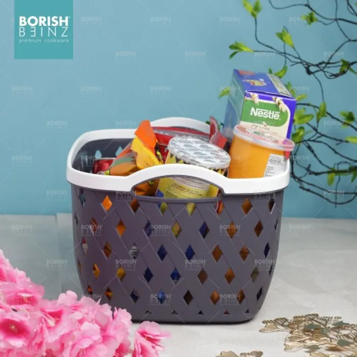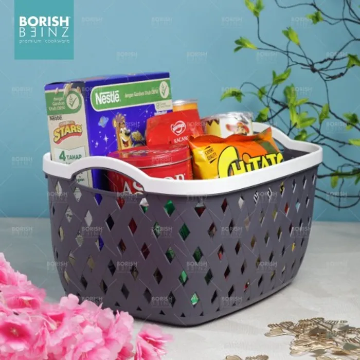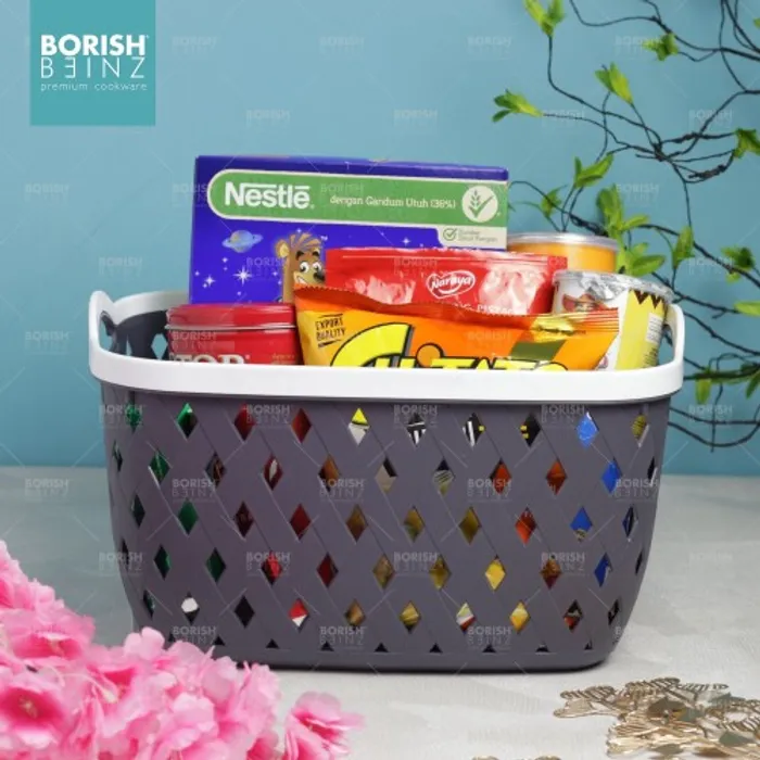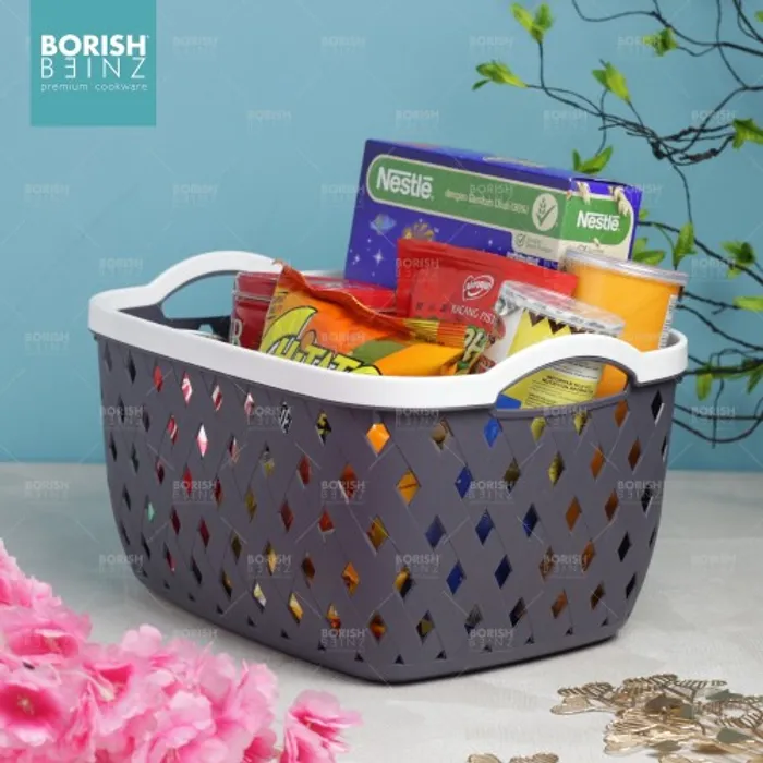 Keranjang serbaguna berbahan plastik tebal. Cocok untuk menyimpan aksesoris, kosmetik, snack, tempat souvenir.