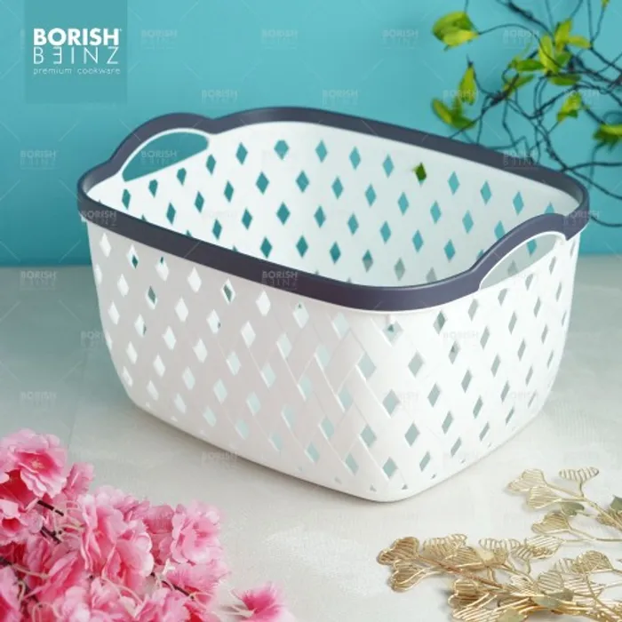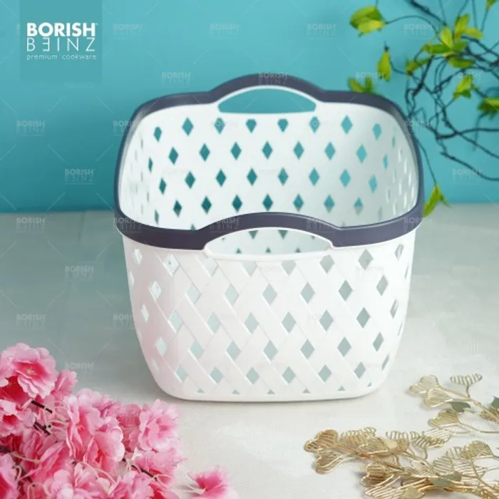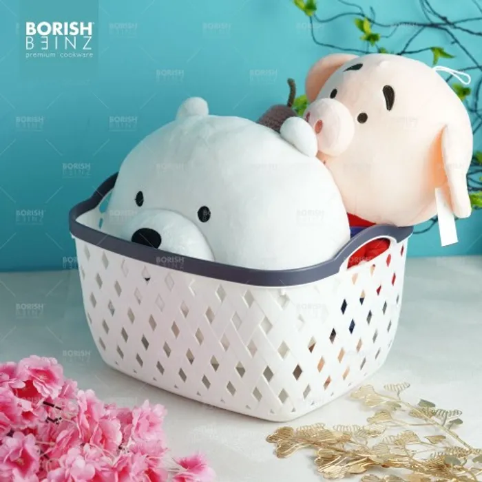 Keranjang serbaguna berbahan plastik tebal. Cocok untuk menyimpan aksesoris, kosmetik, snack, tempat souvenir.