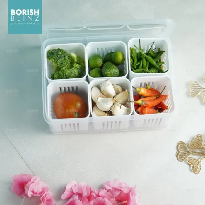 Kotak Penyimpanan dengan 6 sekat ini dapat memudahkan anda untuk menyimpan berbagai jenis bahan baku bahkan bahan makanan sekaligus.