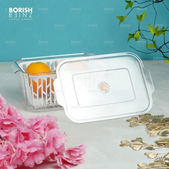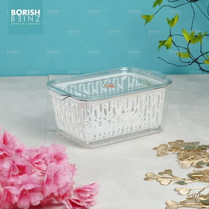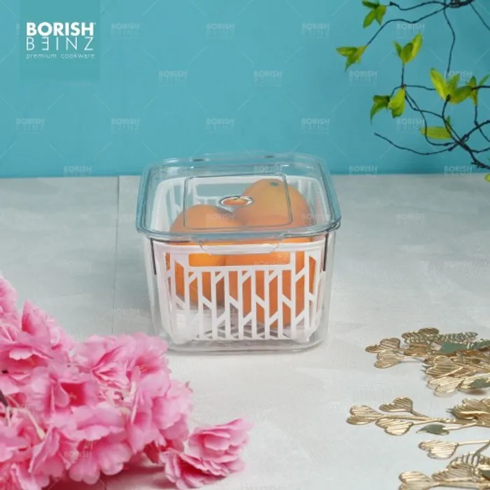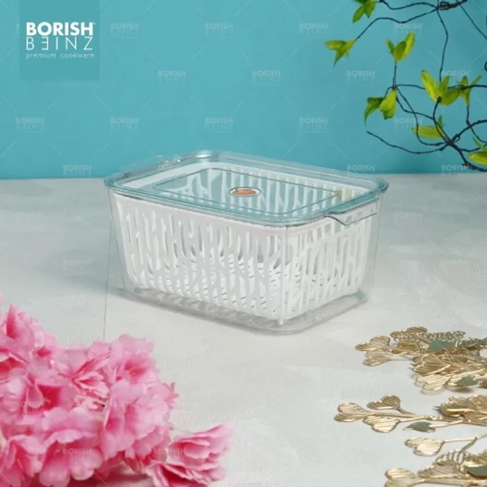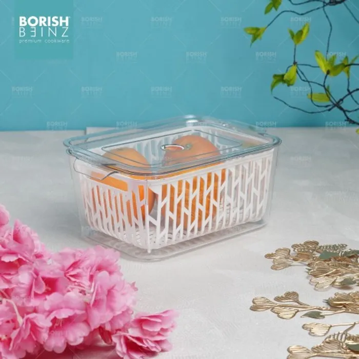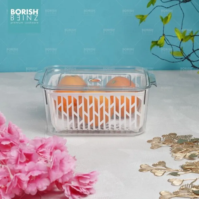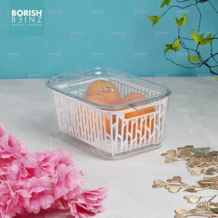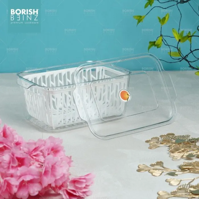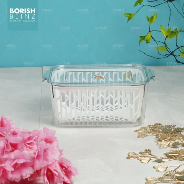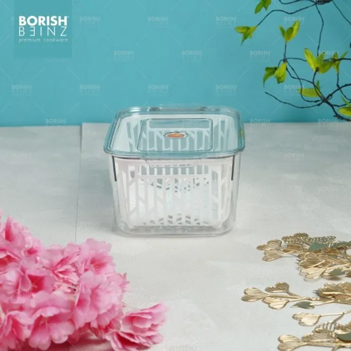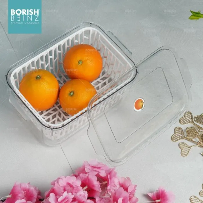 Desain keranjang pengeringan multifungsi. Keranjang pengering bawaan dapat menyaring air pada permukaan buah dan sayuran; ini juga dapat digunakan sebagai penyaring untuk mencuci buah dan sayuran untuk menyaring air. Transparan dan terlihat: Anda dapat dengan cepat melihat isi kotak penyimpanan, secara efektif menghemat waktu untuk menemukan hal-hal yang dibutuhkan.