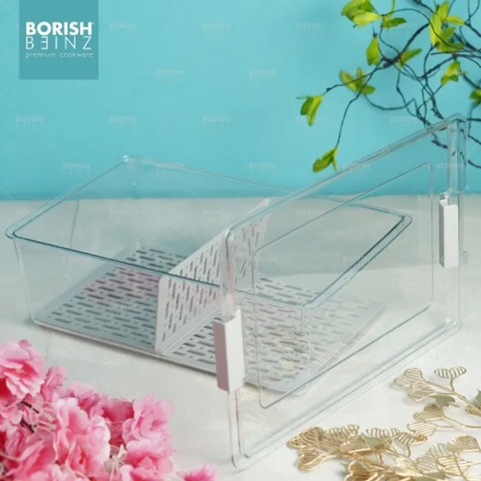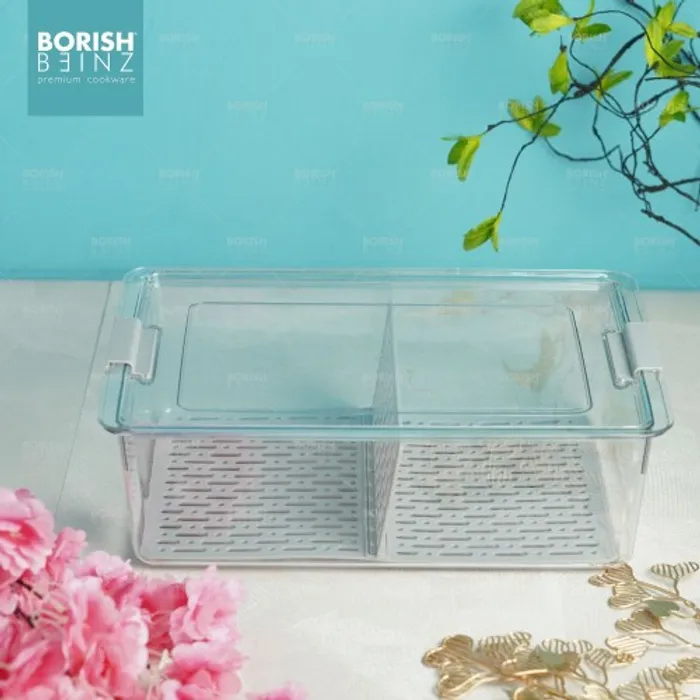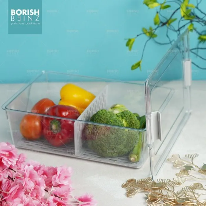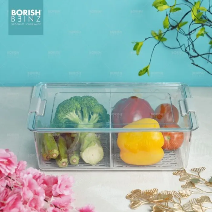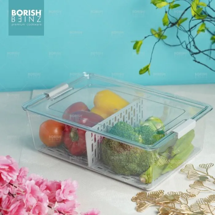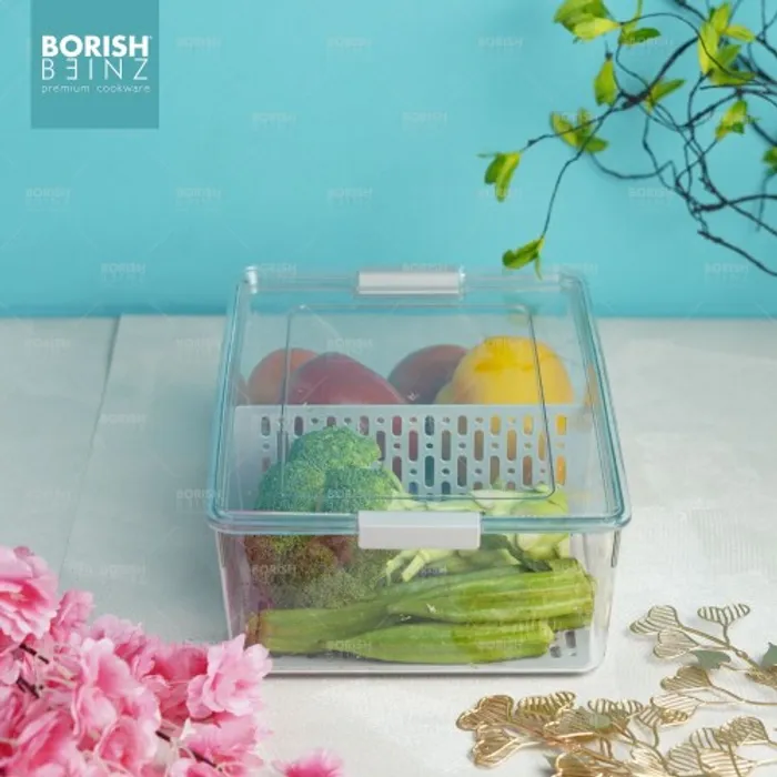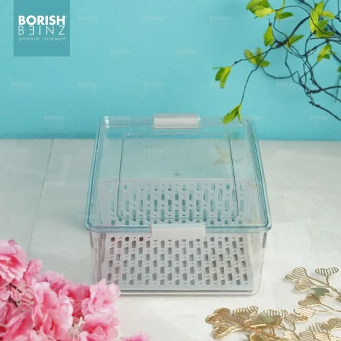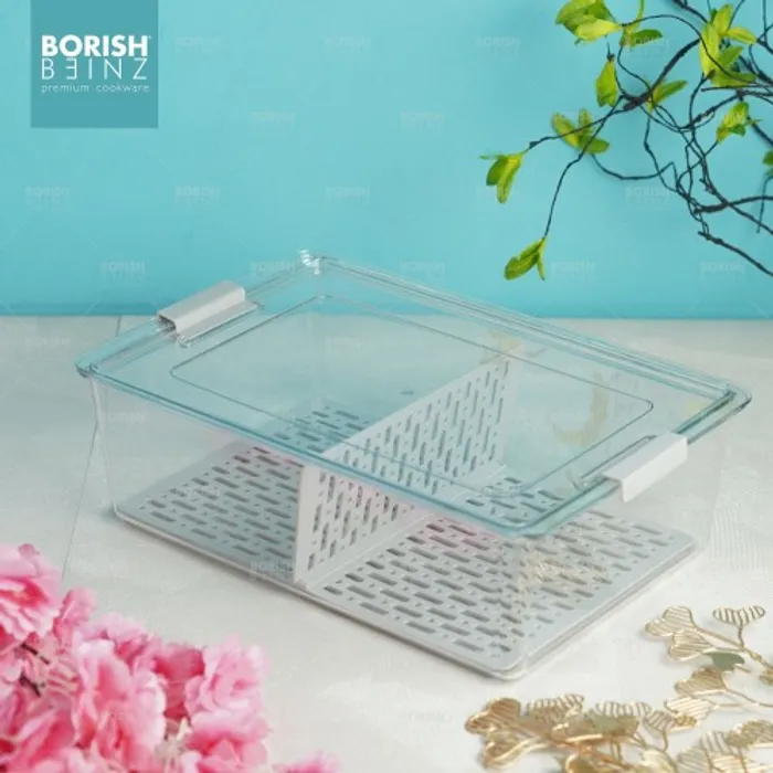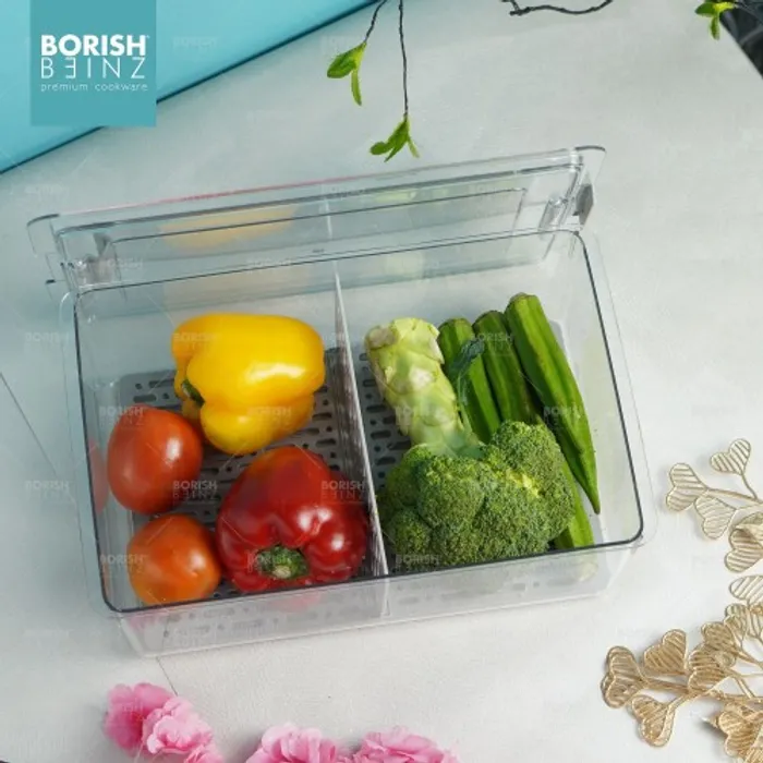 Desain keranjang pengeringan multifungsi. Keranjang pengering bawaan dapat menyaring air pada permukaan buah dan sayuran; ini juga dapat digunakan sebagai penyaring untuk mencuci buah dan sayuran untuk menyaring air. Transparan dan terlihat: Anda dapat dengan cepat melihat isi kotak penyimpanan, secara efektif menghemat waktu untuk menemukan hal-hal yang dibutuhkan.