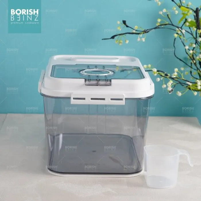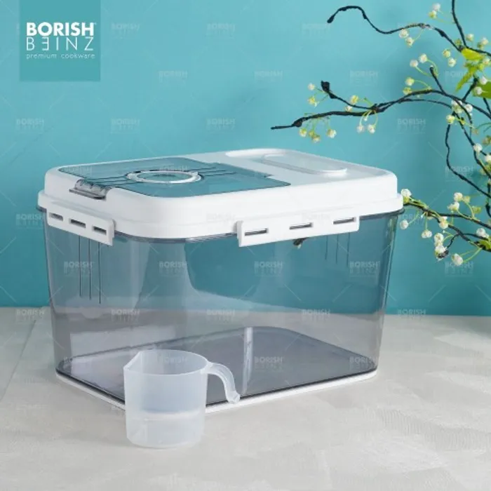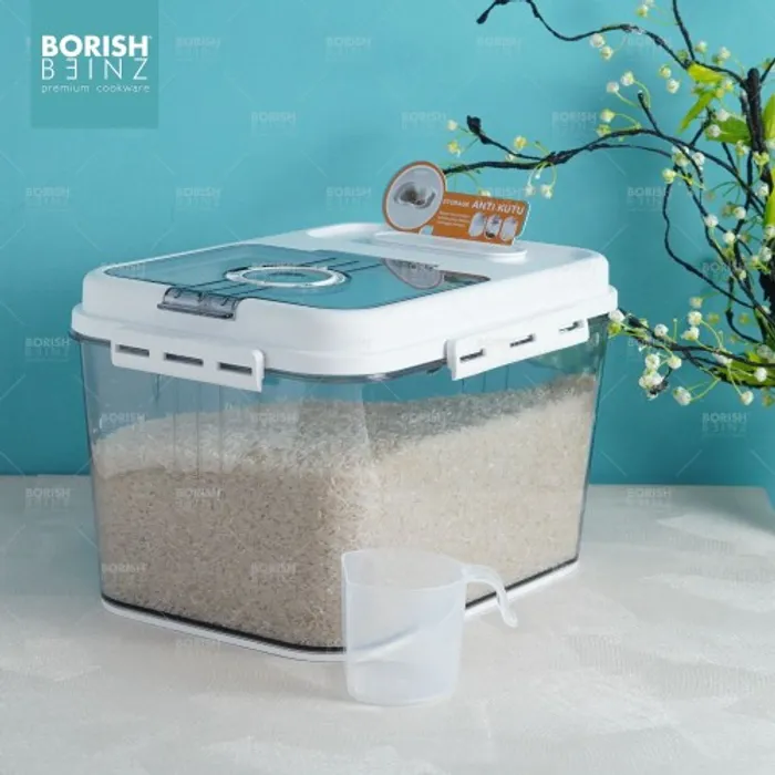 Dispenser beras otomatis anti lembab, dilengkapi cangkir untuk mengukur. Tempat beras dengan menggunakan material yang aman untuk beras yang disimpan awet dan tidak merusak kualitas beras yang disimpan.