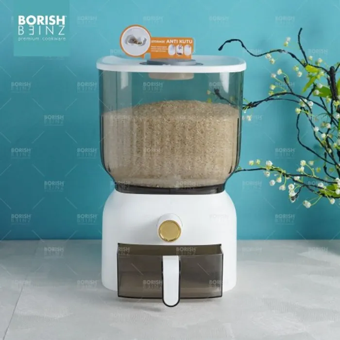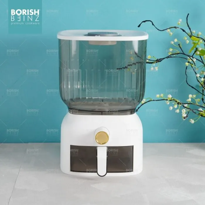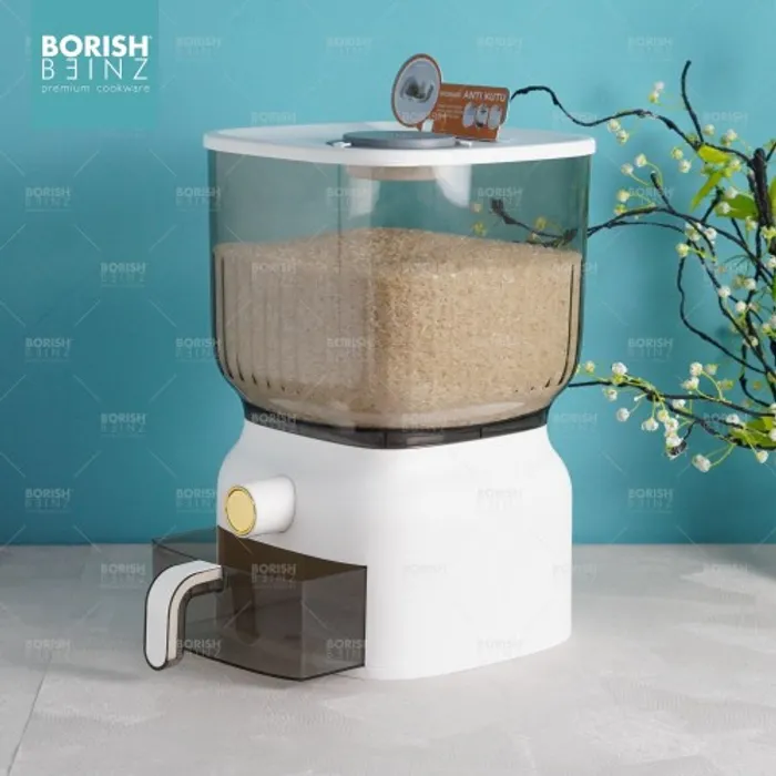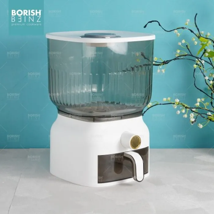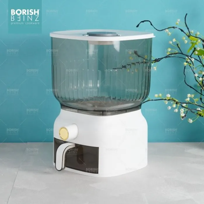Dispenser beras otomatis anti lembab, dilengkapi cangkir untuk mengukur. Tempat beras dengan menggunakan material yang aman untuk beras yang disimpan awet dan tidak merusak kualitas beras yang disimpan.