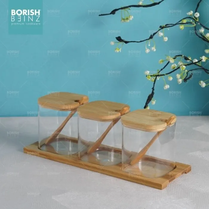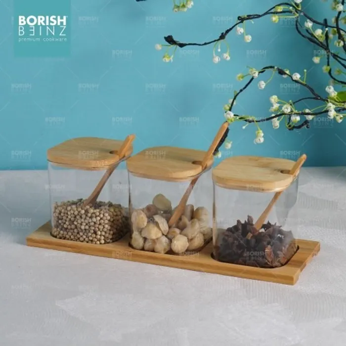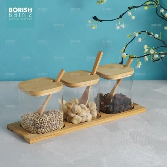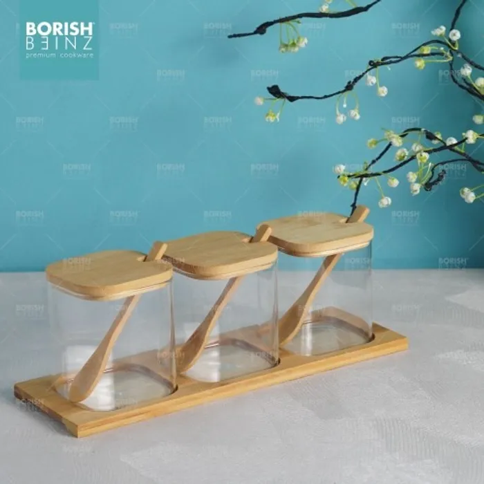 Satu set terdiri dari 3 tempat bumbu . Masing - masing tempat bumbu ada tutup nya dan dilengkapi sendok bumbu.