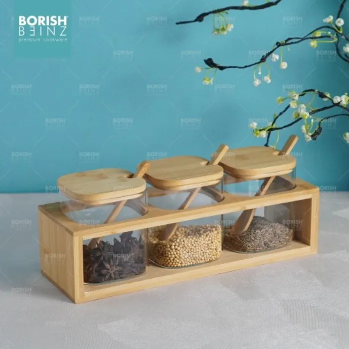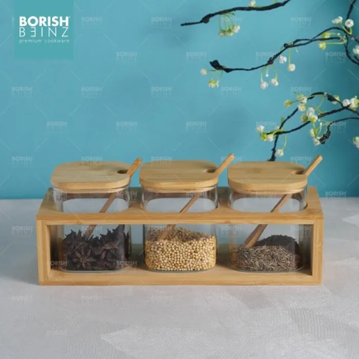 Satu set terdiri dari 3 tempat bumbu . Masing - masing tempat bumbu ada tutup nya dan dilengkapi sendok bumbu.