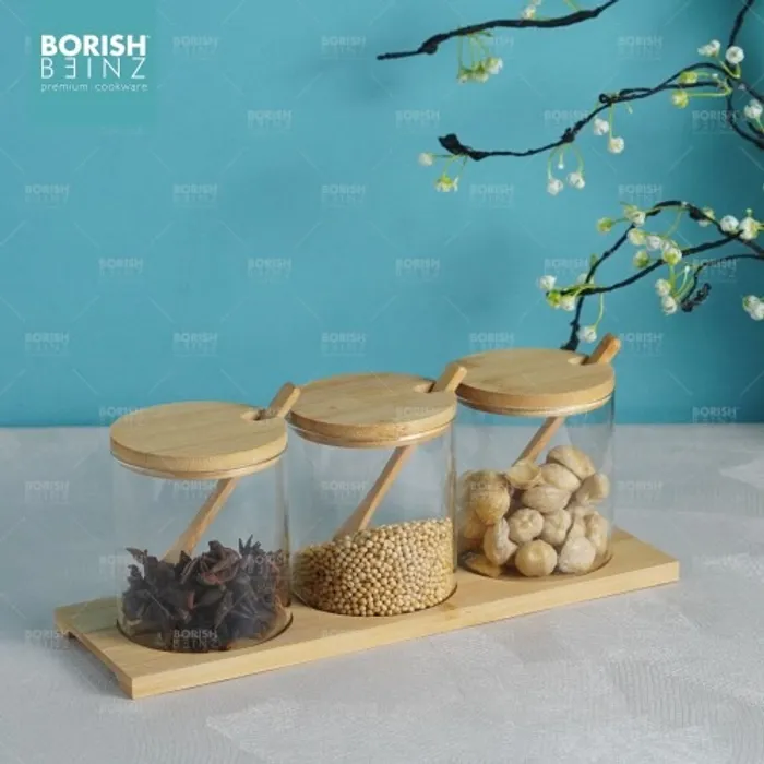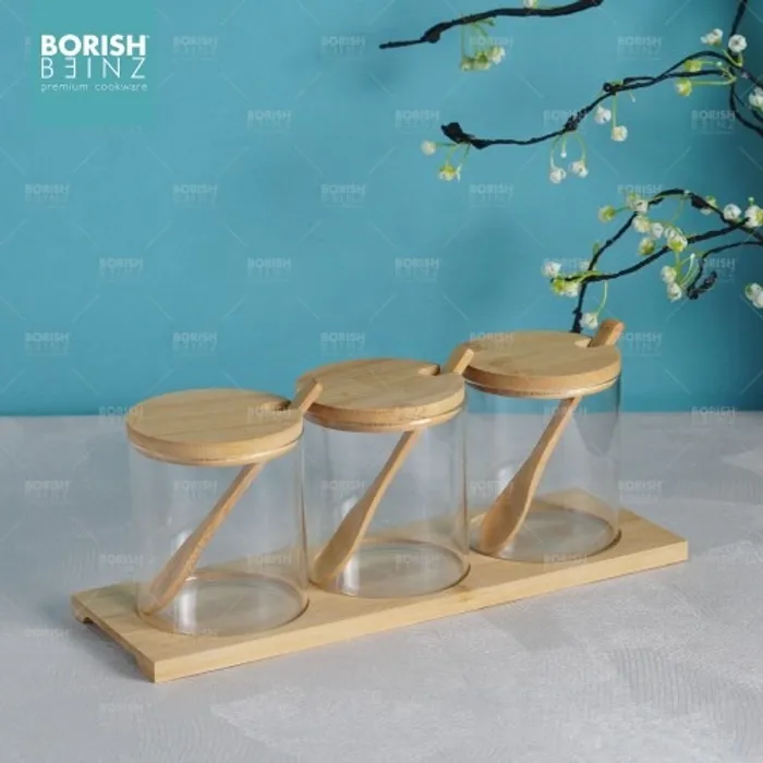 Satu set terdiri dari 3 tempat bumbu . Masing - masing tempat bumbu ada tutup nya dan dilengkapi sendok bumbu.