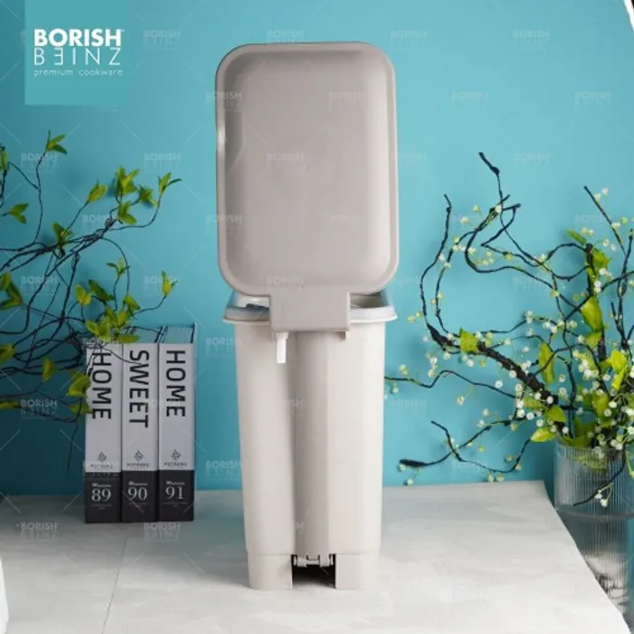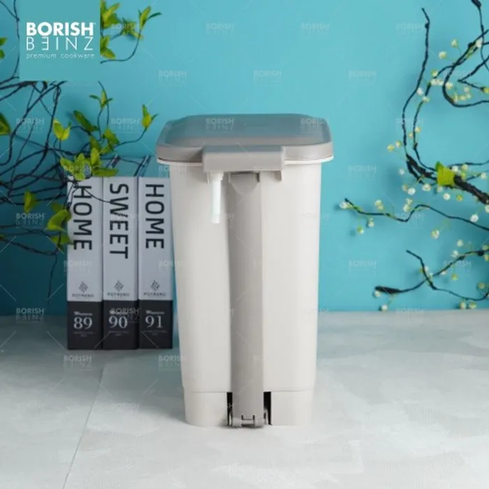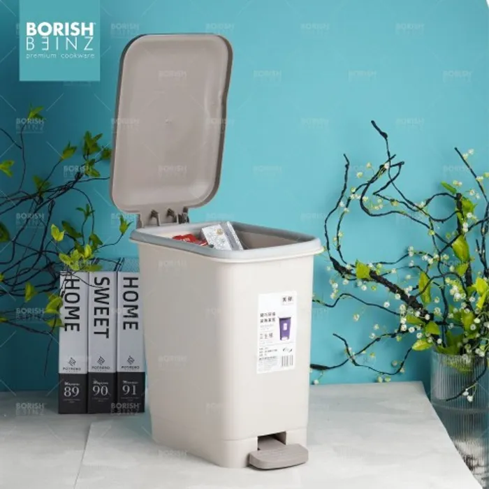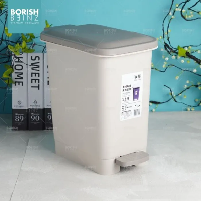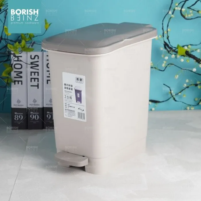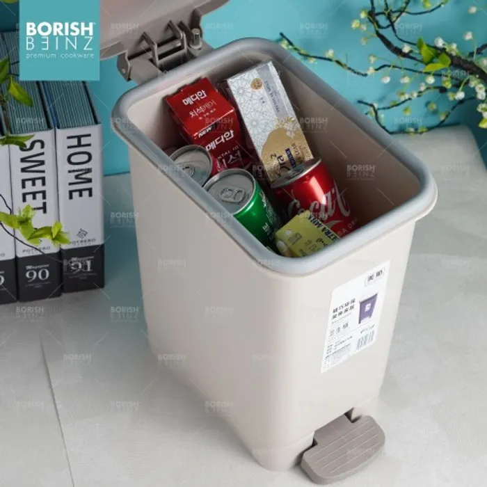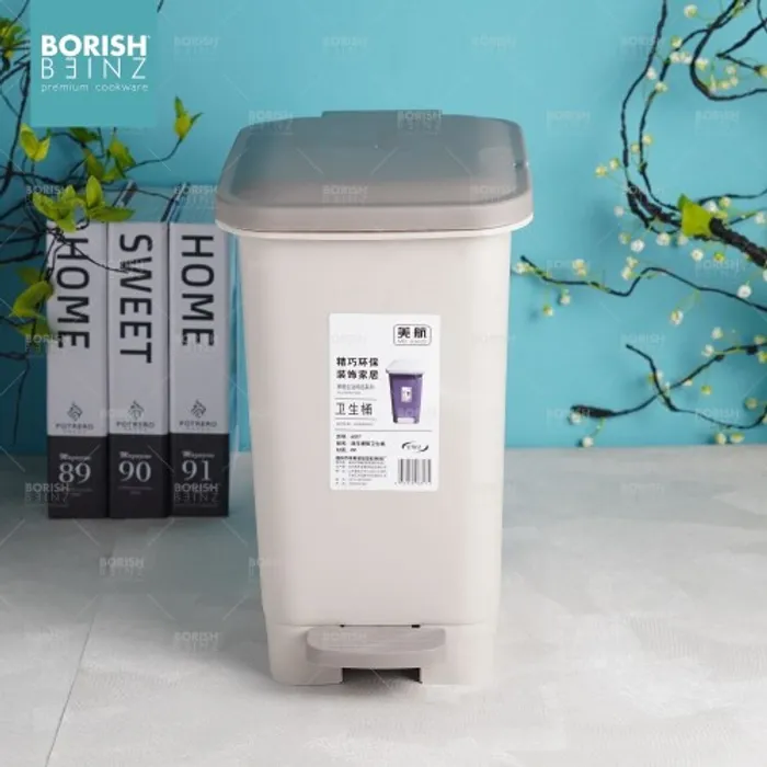 Tempat sampah kotak model injak dengan fitur penutup soft closing .