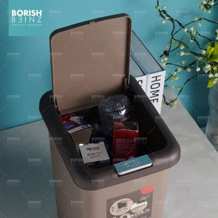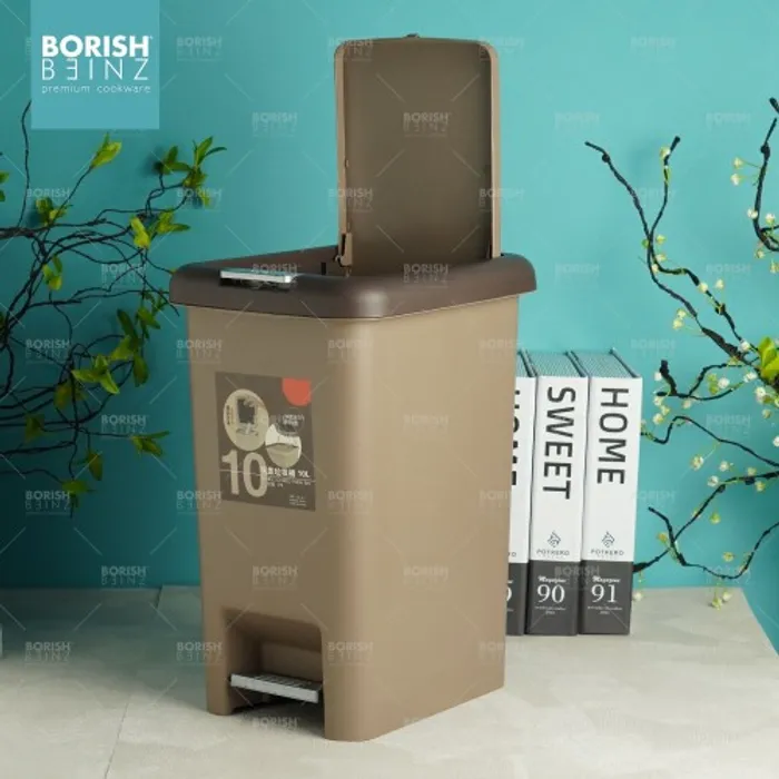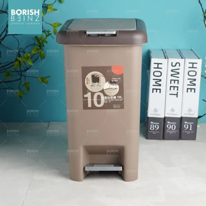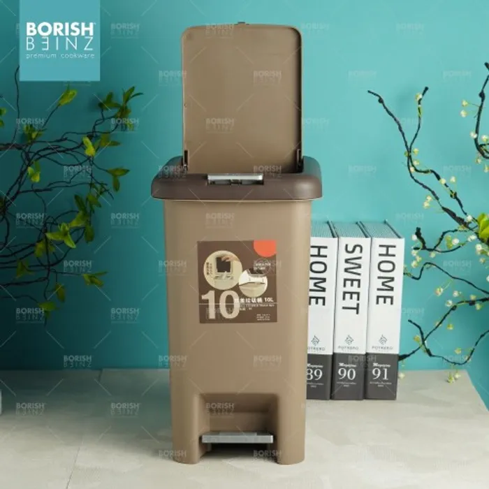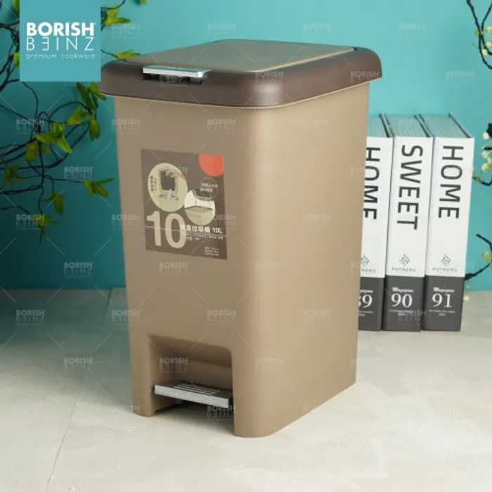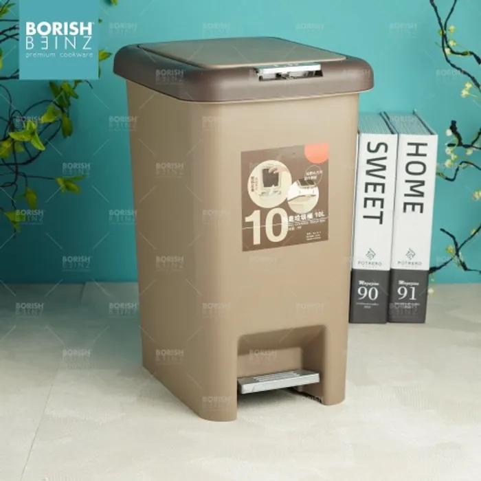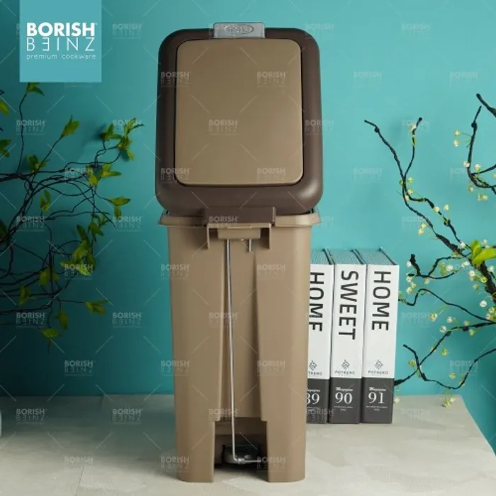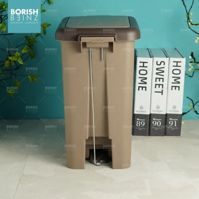 Tempat sampah kotak model Injak dengan fitur penutup ganda berupa tombol diatas tempat sampah dan injakan di bawah tempat sampah untuk kemudahan memasukan sampah kedalam wadah.