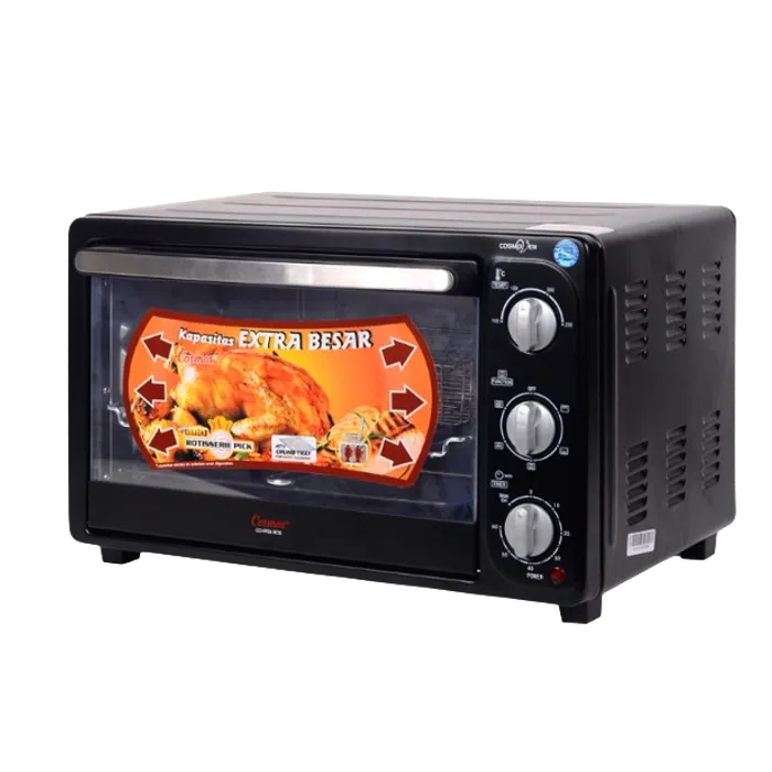 Oven Cosmos berkapasitas besar 26 liter untuk memanggang berbagai macam masakan seperti kue kering, ayam panggang, dll. Dilengkapi BBQ Rotisserie Pick (Pemanggang berputar otomatis) dan Fish Grill (Pemanggang Ikan).