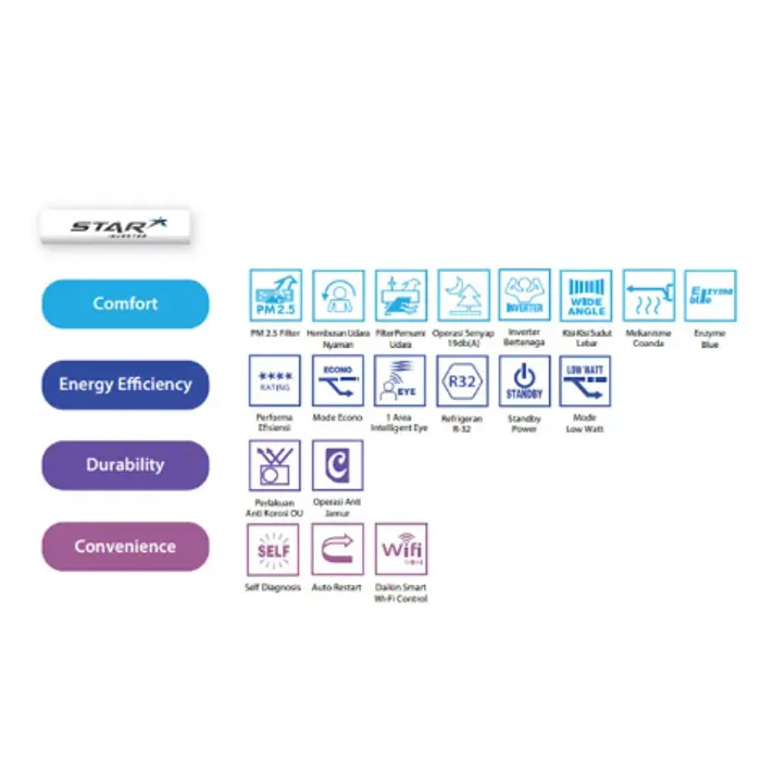 Refrigeran Generasi Terbaru R32, Seri Star Inverter menggunakan refrigeran R32, yang merupakan refrigeran ramah lingkungan dengan potensi pemanasan global yang rendah. Selain itu, refrigeran ini juga memiliki efisiensi tinggi dalam proses pendinginan, sehingga mengurangi konsumsi energi.