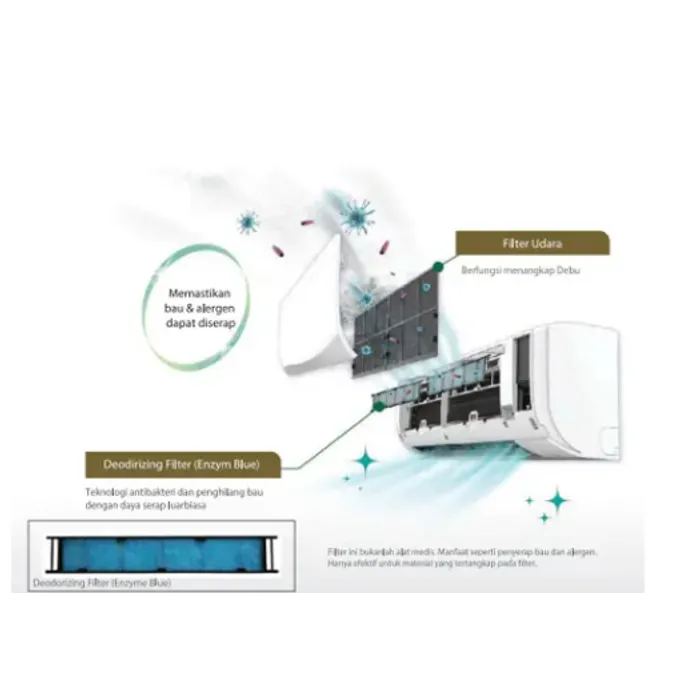 Enzyme Blue Deodorizing Filter dapat menghilangkan bau dan bakteri dengan daya serap yang luar biasa. Filter ini secara efektif membersihkan udara yang tersebar di dalam ruangan, sehingga udara yang dihasilkan lebih segar dan bebas dari kuman.